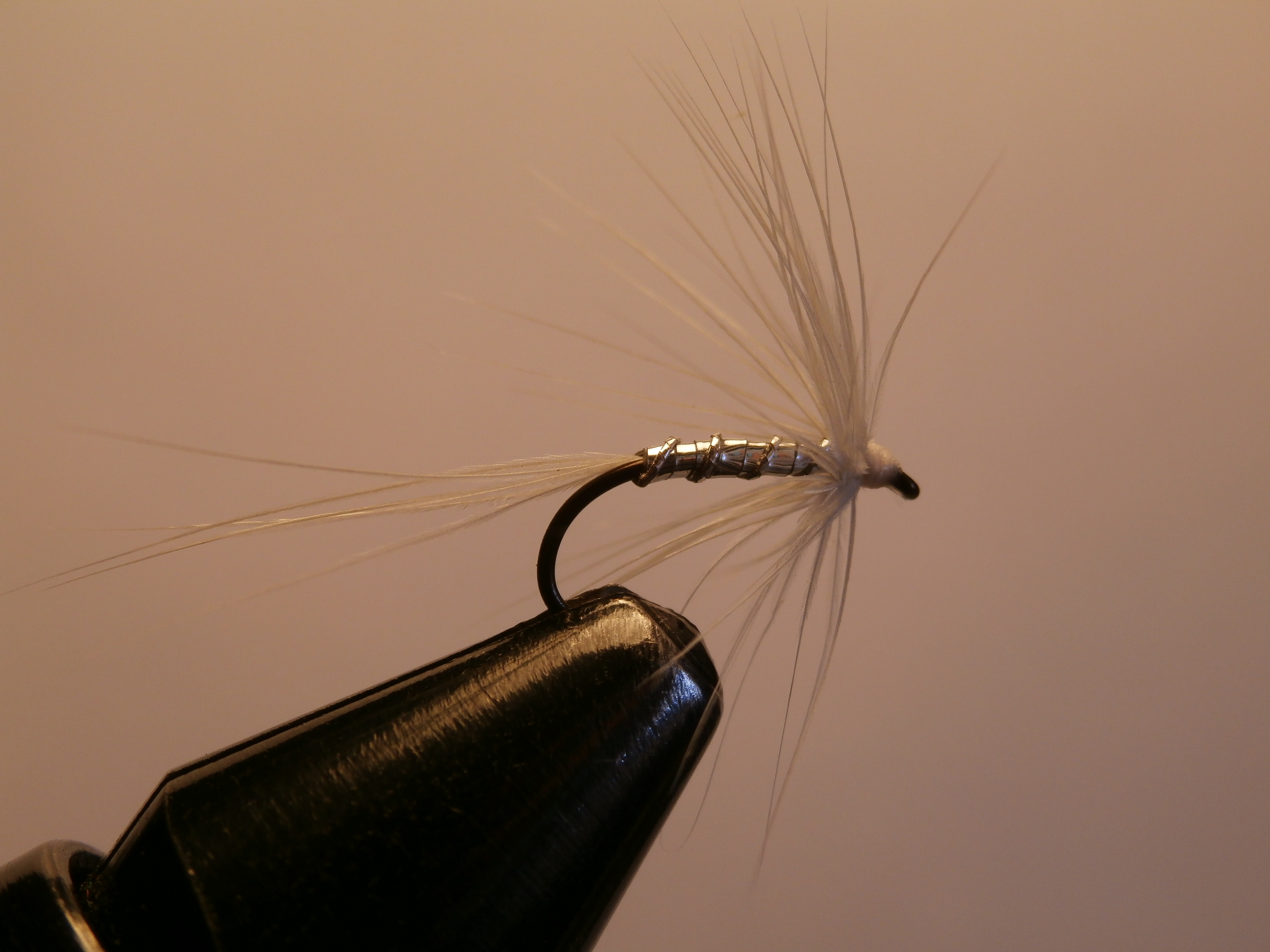 Fly patterns don’t come much simpler than this one. The hackle is white hen and the tails are made from a few whisks of white hen hackle fibres. The body is silver tinsel with a silver wire or oval tinsel rib to protect it. The only change I make from Dietrich’s tying is that I prefer Fl. white tying silk as opposed to the black in the original. I varnish the head with clear varnish to keep the head a nice bright white which I like to think is an additional trigger point. Sizes 12 and 14 heavy wire hooks are my prefered options.