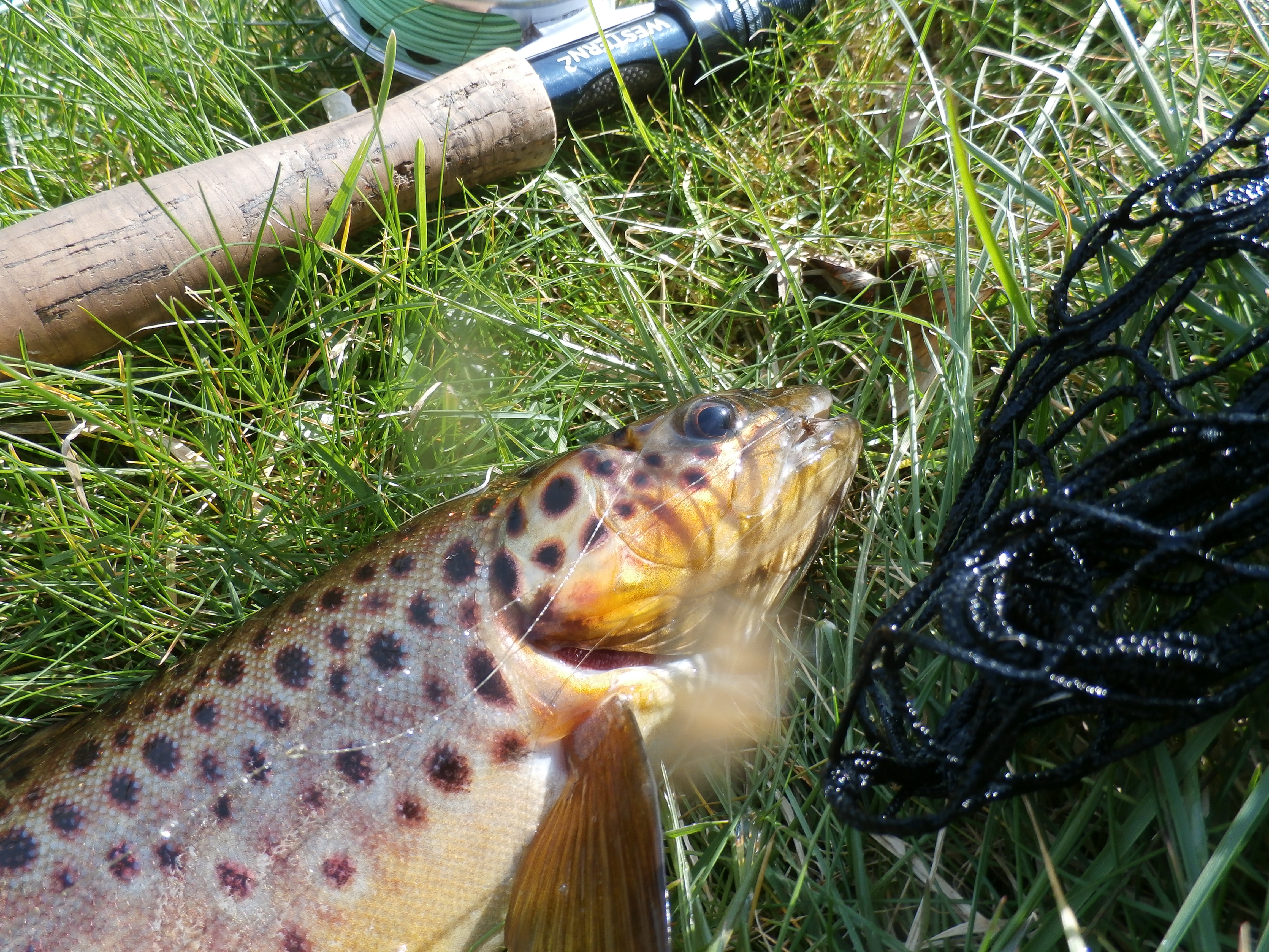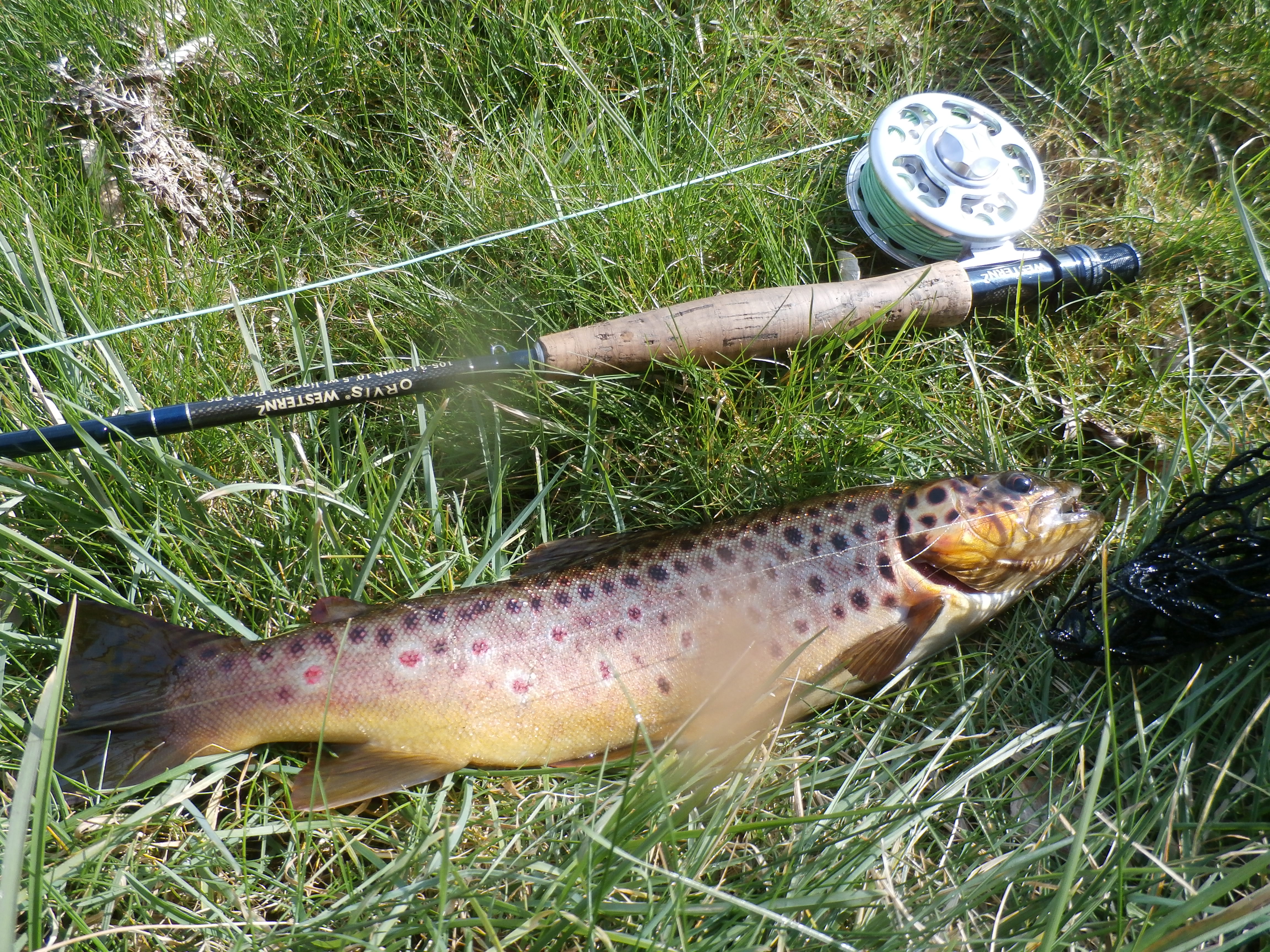 I cast as close to the far bank as I dare (the actual spot is above) and as soon as my flies touch the surface a large brown head appears and then promptly disappears as my line tightens. It is obviously a good fish and he tugs and runs with spirit but I get him to the net without much hassle.