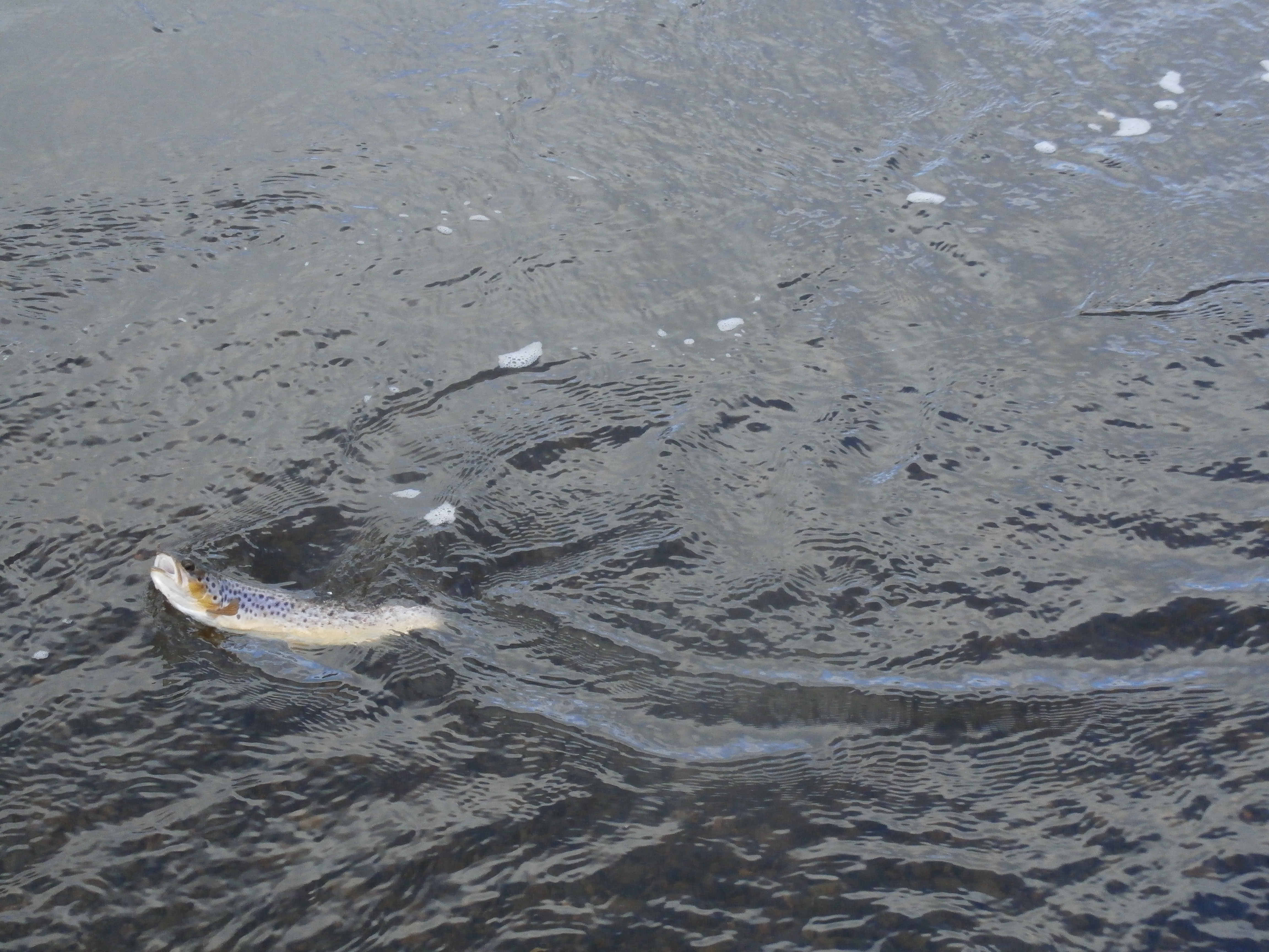 Off I went down to a long, deep pool which was slightly sheltered from the cold wind. I fished this carefully but once again came up empty handed. Around the corner was a deep run under a bush, hardly a pool really. I rose a fish (which I missed by a country mile) before finally setting the hook in a nice trout.