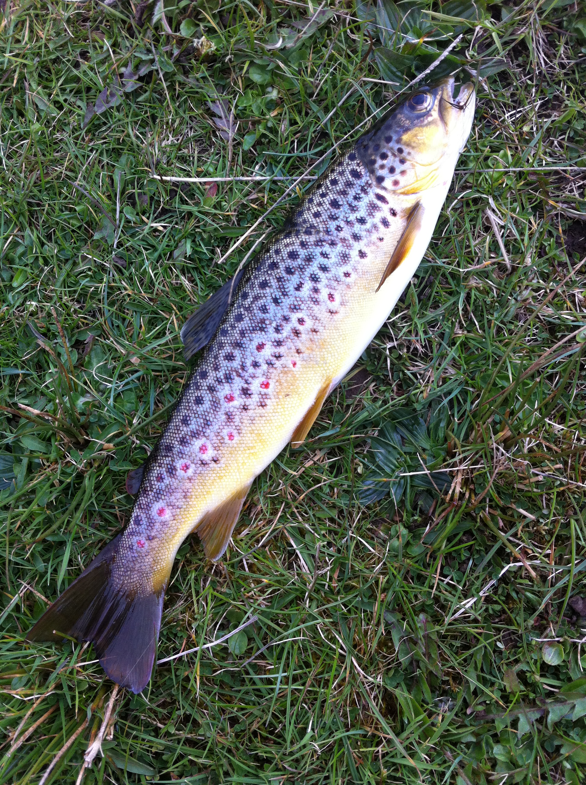 I negotiated some wire and electric fences and got into the water in a large, slow moving pool. I would have prefered to fish it from the throat of the pool but trees on my bank prevented access. I had changed back to the wet fly and was quickly into a lovely trout of better than a pound. A second one followed and then a third, the last one being a bit smaller.