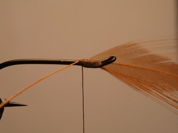 3. Here you tie in another dark ginger cock hackle, again, shorter in barb length than the first hackle.