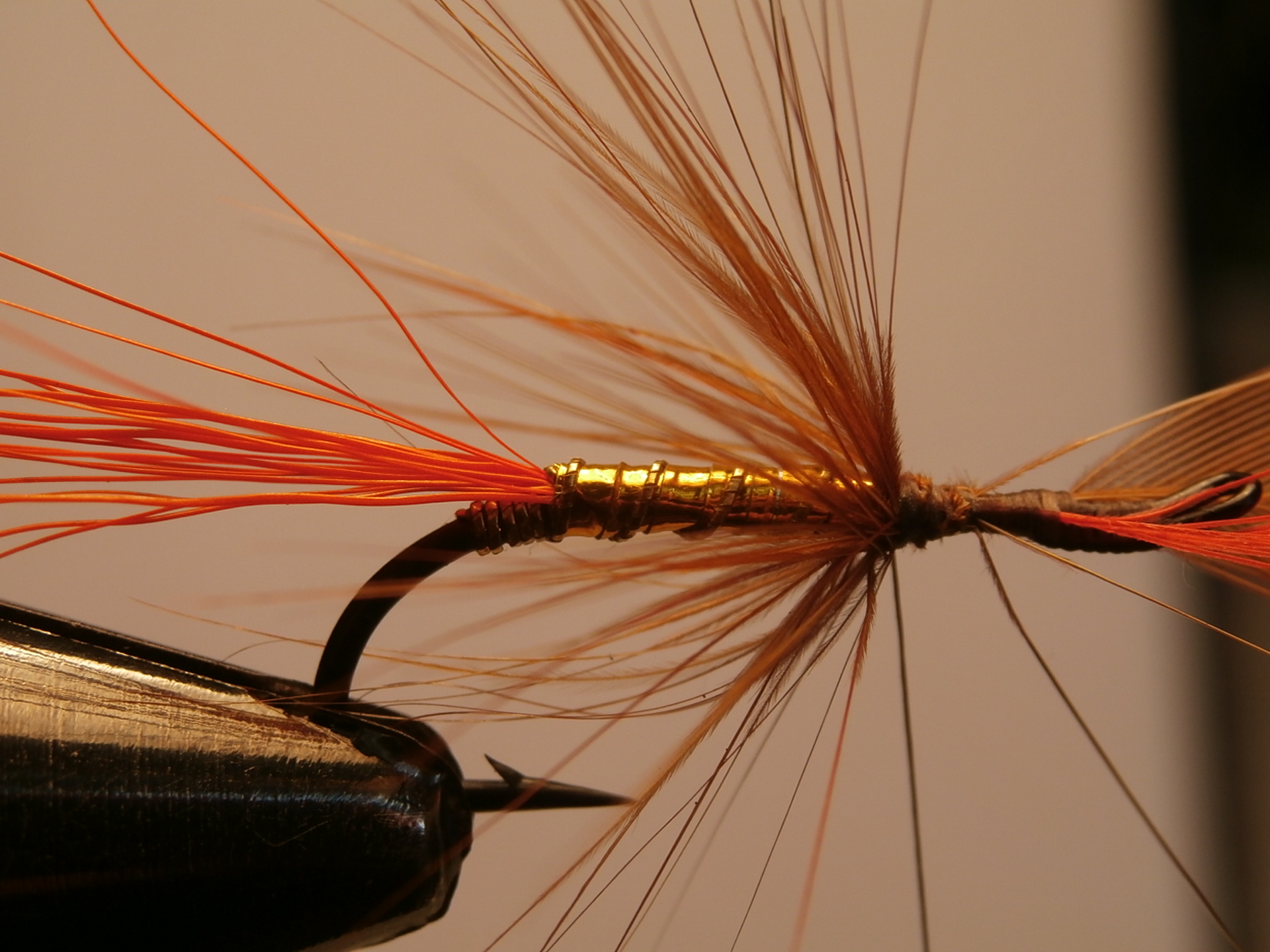 10. The ginger head hackle is given 3 or 4 turns now and tied in in the usual way.