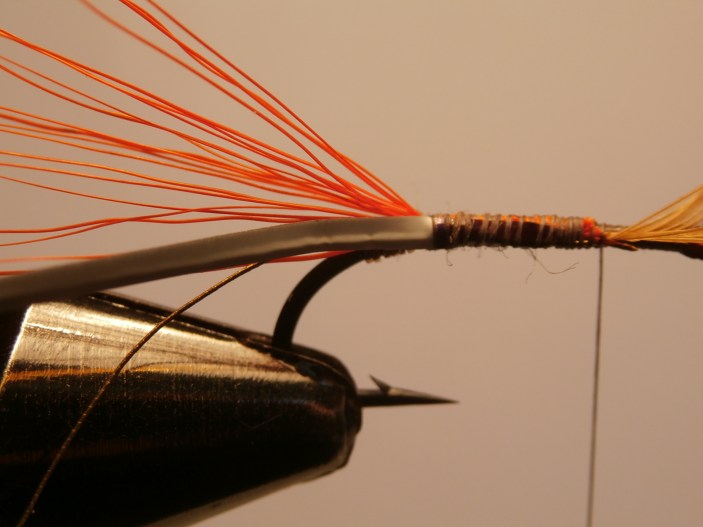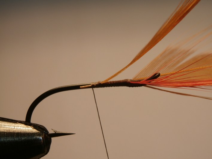 2. Next tie in a cock hackle dyed Fire Orange which is slightly shorter in barb length than the ginger one. Run the tying silk down to a point 2/5ths of the way to the bend.