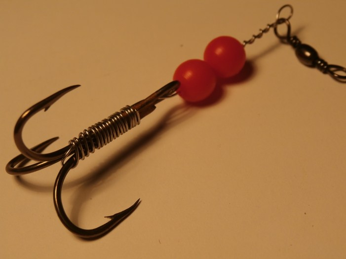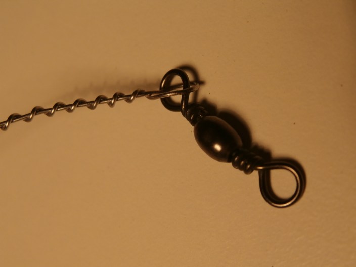 What you end up with is a short trace with a swivel at one end, two beads in the middle and a treble at the end.
