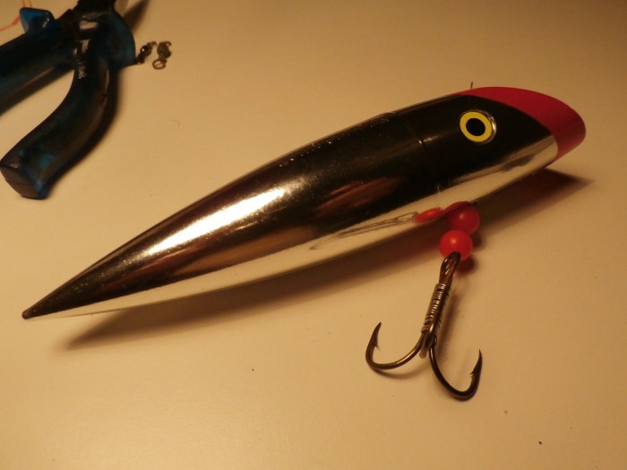 While mooching around in a small tackle shop down an alley in Athlone the other day I happened upon a basket full of odd and ends of tackle sporting the tempting sign ‘half price or less’. So I plunged into the task of sifting through the assorted rigs, floats, baits and sinkers. Luminous poppers, bouncing bettys, zoomer floats and myriad other angling oddities were closely examined and rejected. Then, right at the very bottom of the basket my eye fell on a huge shiney plug. Ah ha! Now this was interesting. I asked the shop owner ‘how much? ‘Three Euro for that – it is supposed to come with a special mount but it’s missing’ As this lure normally retails around €12 I had bagged myself a real bargain. All I had to do was make up a new trace and I was in business.