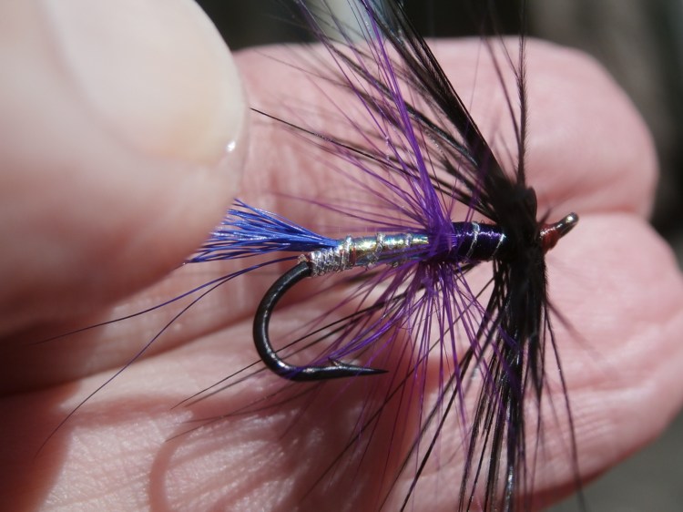 I used Opal Mirage for the rear body and purple floss for the front. An oval silver tag and rib were added too. The tail is made of a slim bunch of purple bucktail instead of the more normal wound GP body feather.A centre hackle of a doubled cock hackle dyed purple is wound at the joint of the body sections and a long fibred hen hackle dyed black is wound at the head. I used red tying silk and left that showing at the head. the example in the photos is tied on a size 10 single hook.