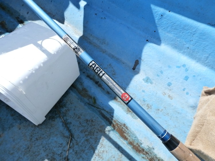 Tea-coloured and running a couple of feet above summer level, the river looked very ‘fishy’ when we rocked up at a little after 11am. This river needs high levels to attract the fish in and we certainly had near perfect conditions today. Recent reports were less encouraging though and we had no confirmed catches to feed our optimism. Undeterred, we tackled up and set off upstream. Ben was using a recent acquisition, an old glass fibre ABU Atlantic spinning rod in a rather fetching blue colour which he had picked up at a car boot sale. For a rod that must be all of 40 years old it was in fantastic condition.