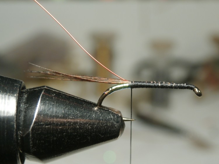 This is a deadly trout fly but I fancy giving it a try in larger sizes for salmon on the lake. It is just your bog-standard Invicta with a red tail and tag. I added an extra couple of head hackles for some additional movement.