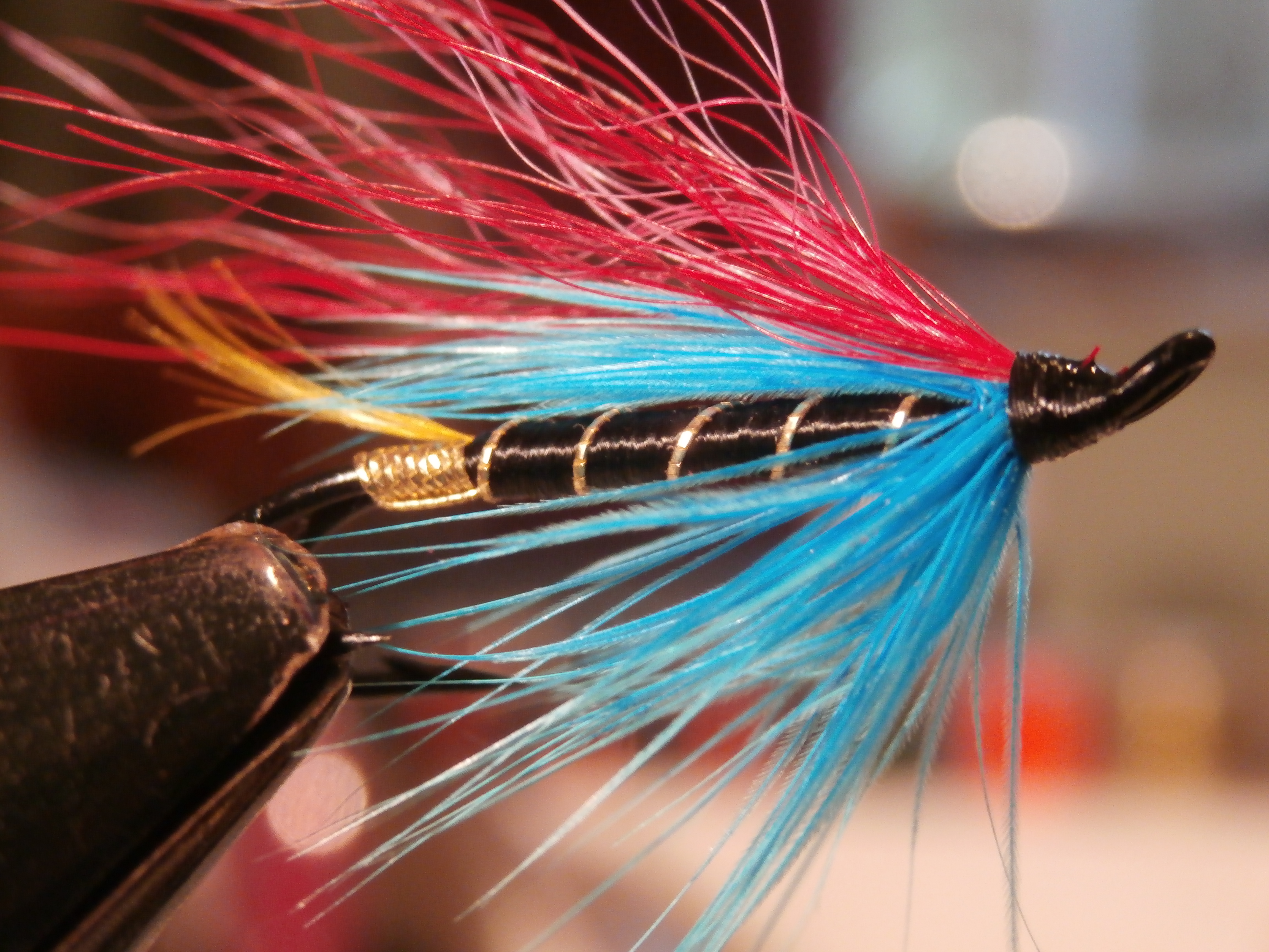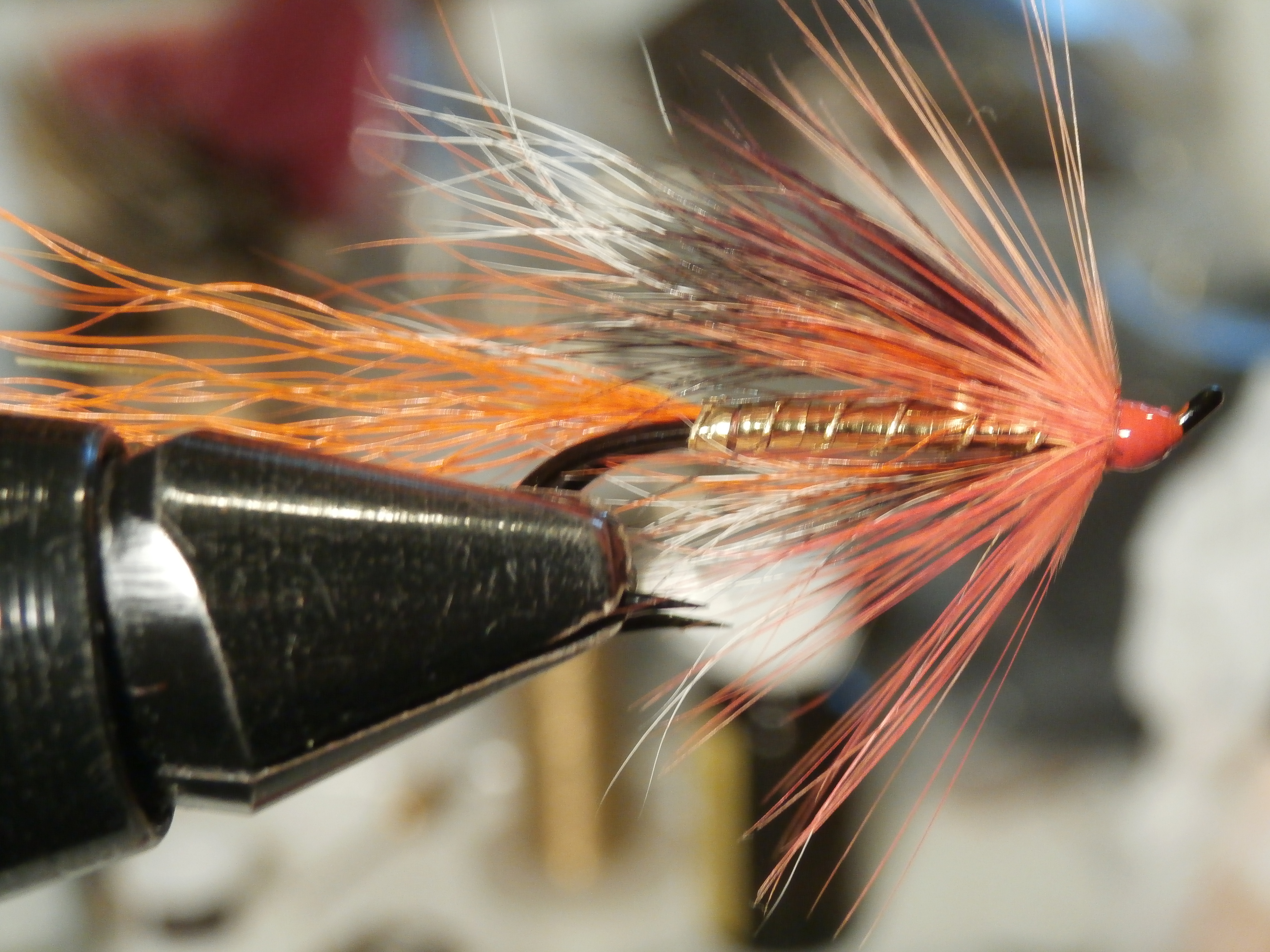 Over wing: tied on top of the hook and slightly longer that the under wing. Orange squirrel under Natural grey squirrel under GP body feather fibres dyed claret
