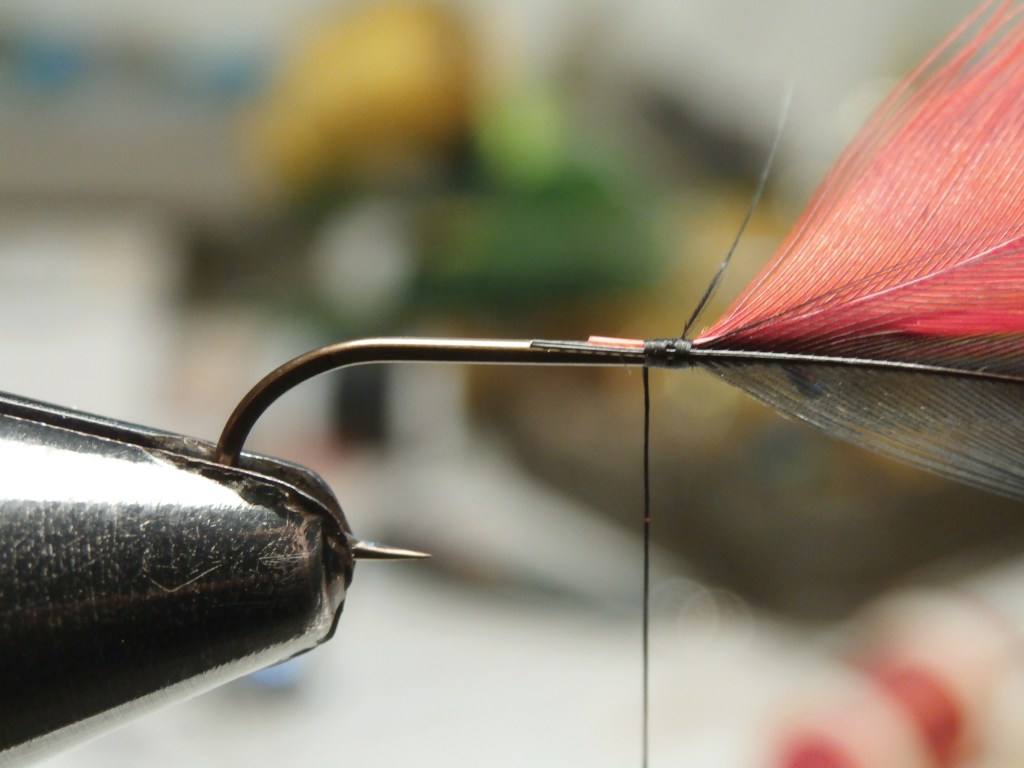 I like to add a couple of turns of a long fibred hen hackle dyed red under the wings but you may decide not to bother with this refinement.