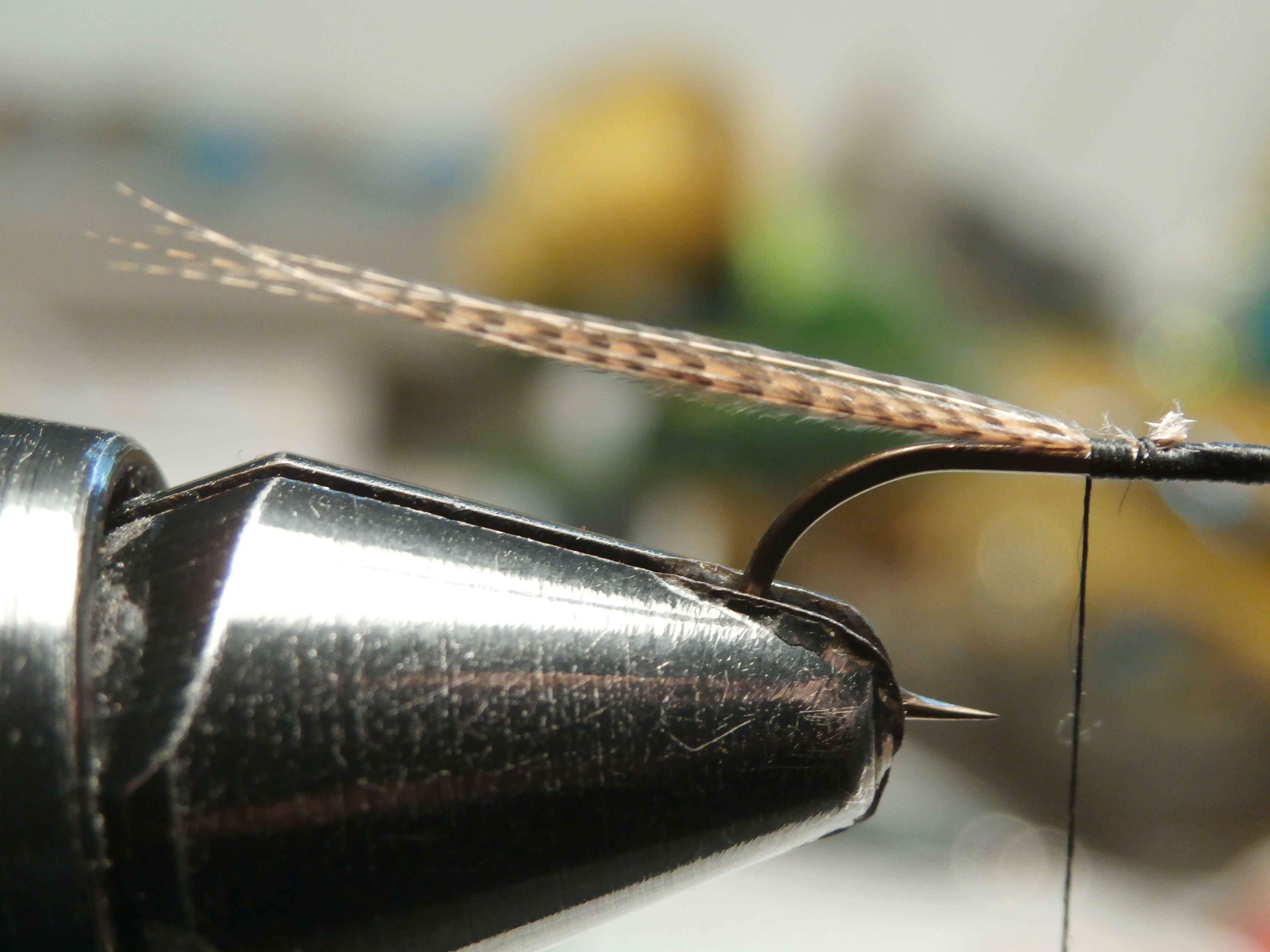 Make the tail out of a few fibres of nice dark bronze mallard. Tie them in so the tails are about the same length as the hook shank. This is important as short tails will upset the balance of the fly and makes it look odd. I you feel like adding a bit of bling then a couple of strands of pearl flash can be added to tail at this stage.
