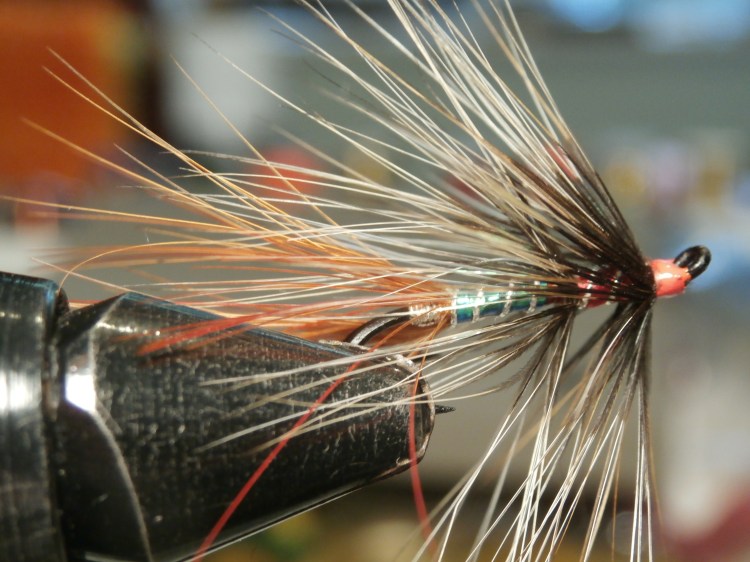 I have tied green shrimp pattern for the summer grilse fishing but it has yet to be tried so this one comes with no recommendations (yet). The silver tag and a wound GP body feather as a tail are standard. The body is in two halves, the rear being green tinsel ribbed with silver and front is red fur or silk, also ribbed with silver. A doubled badger cock hackle is wound at the joint of the body and another one at the head. You could add a couple of Jungle Cock eyes too if you feel the need.