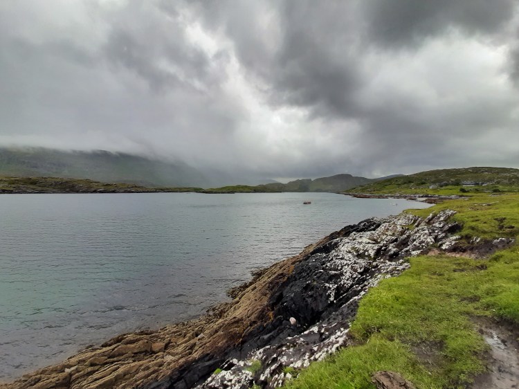 I have to say that he weather forecast did not inspire confidence with heavy rain spreading to the west according to those who should know about such matters. Low cloud draped itself over the mountains all the way from Westport to the harbour, hiding the sunshine and adding to the sense of grandure. Tourists milled around the only street in Leenaun, most of them sensibly clad in brightly coloured waterproofs. Tour buses disgorged their cargo at the usual spots where the breathtaking views of sea and mountain are snapped again and again. A land of endless selfie opportunities. The rain started just as we turned off the main Clifden road and it steadily increased in volume as we wriggled along the narrow track to the edge of the sea.