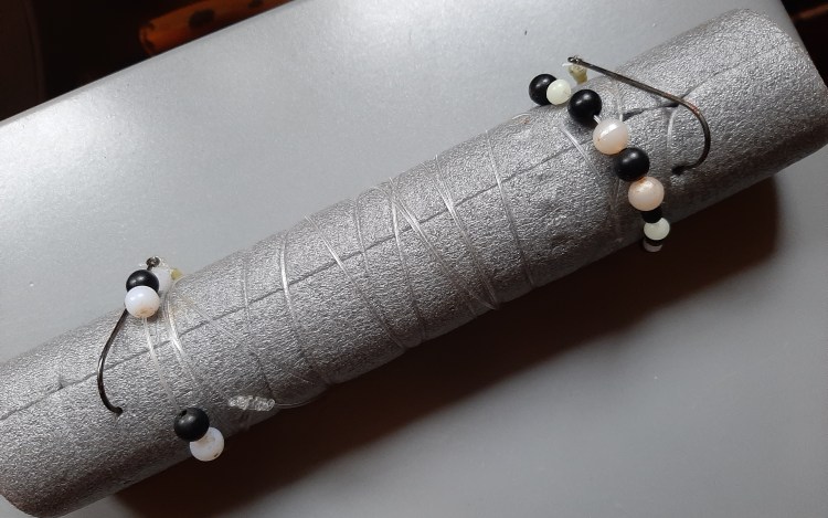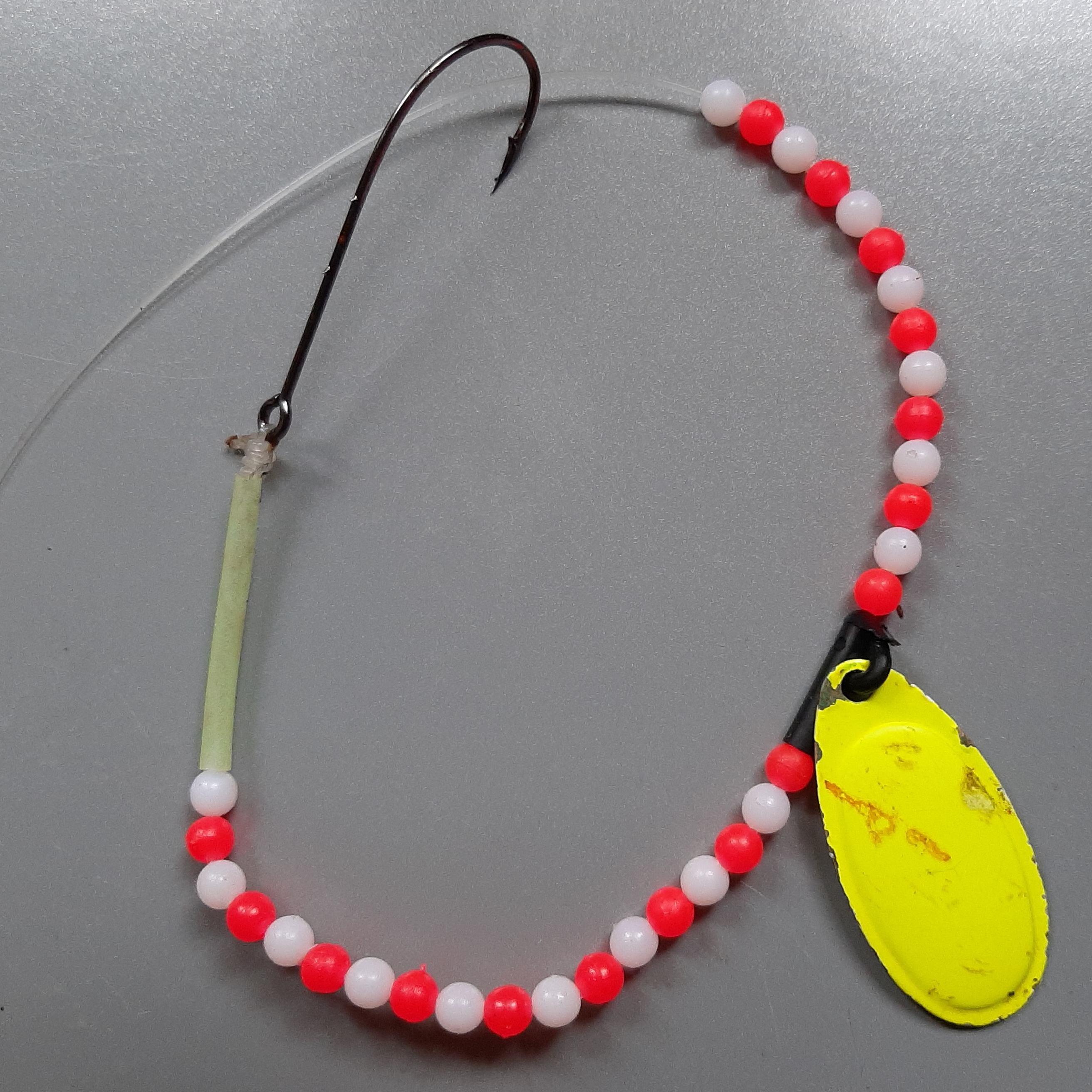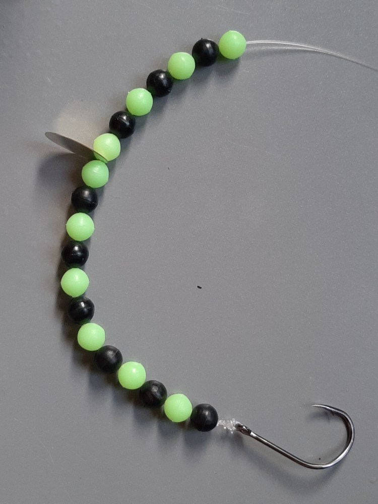 Spinning blades such as those used on flying C lures are often used, placed somewhere in the middle of the string of beads. Colours vary through the whole range of silver, gold or copper but fluorescent yellows and oranges are especially favoured. The best way to mount these blades is to add small beads below them so they can spin properly.