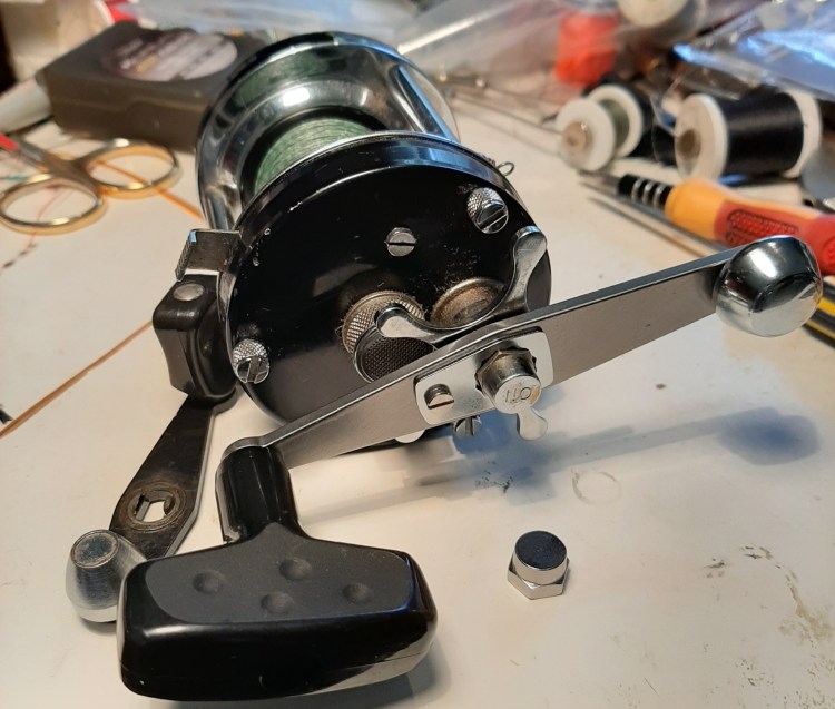 I took a few minutes to swap the standard handle on my old Ambassadeur 6000C for a shiny new power handle. I really like these bigger handles, they are so much nicer to use in the cold and wet which are so common here, especially early in the season.