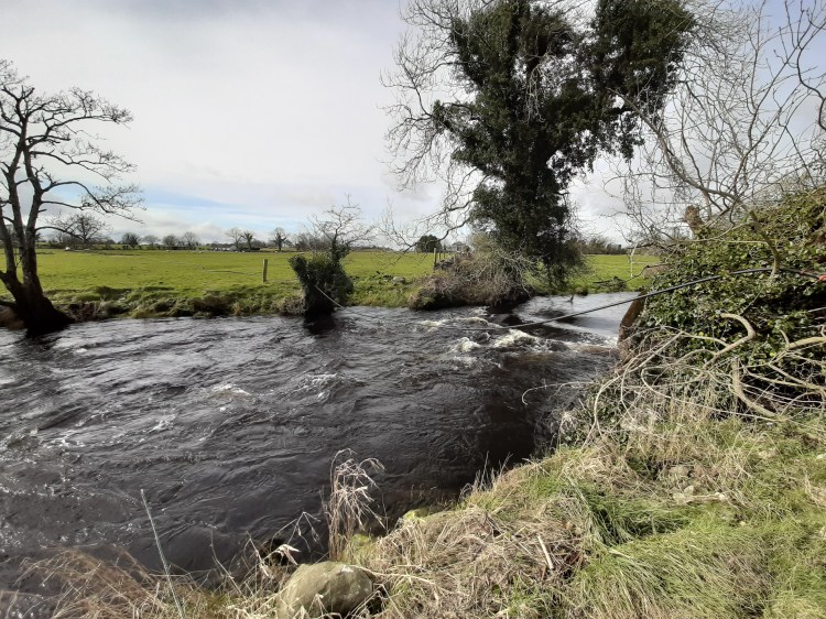 I skipped the fast section of water below the weir. It fishes well on summer evenings when the fish lie there to get some oxygen across their gills and feast on the flies which gather there. But in a flood the waters rage through the rapids making them unfishable.