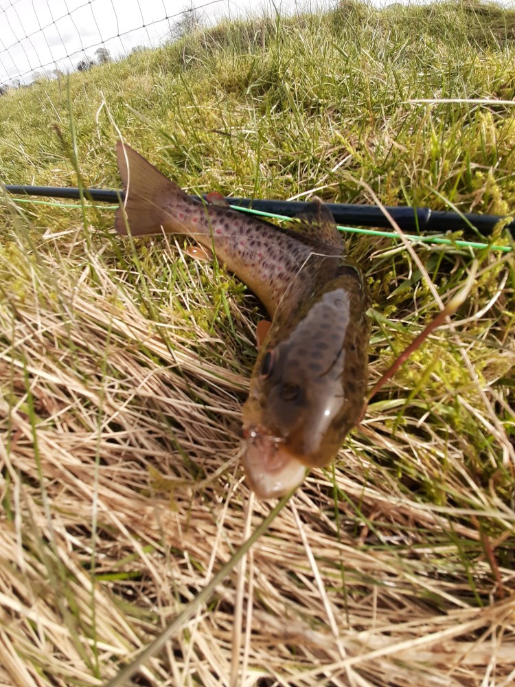 Pulling up at a parking spot after a short detour because I had taken a wrong turning, I stepped out of the warmth of the car into a cool wind. Layers of clothing were hastily applied but it was much colder than I had anticipated and this was not going to improve my chances of success. Numb fingers took ages to knot on the flies but undaunted and dressed like Nanook of the North, I hopped the five bar gate and strode purposefully across the rough pasture. The drain at the edge of the field was chock-a-block with frog spawn, a sure sign that spring is on its way.