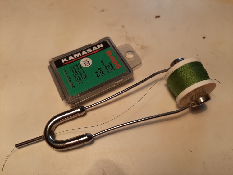 I like to use a Kamasan B405 in size 14 for the hook. Tying silk is olive Pearsall Gossamer. I don’t use anything else for the tying silk, I have tried other silks but they don’t work so stick to the lovely greeny-olive Pearsall,s.