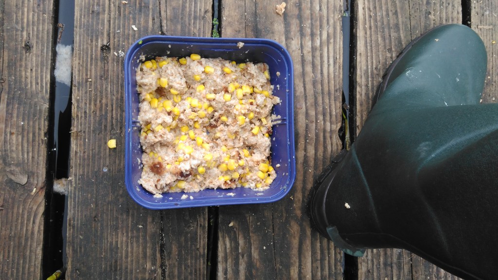 Plumbing the depth I found 15 feet of water close in so I set up the float rod with 3 pound straight through and a size 14 hook adorned with a single ear of sweetcorn. My feeder rod and old Cardinal reel full of 6 pound mono was rigged with an open cage feeder and a size 10 hook tied to 9 inches of 3 pound. 3 ears of sweetcorn were pushed on to this hook and I lobbed it out a few yards. This process was repeated a few times so the feeder full of bread and corn could unload in the same area to try and attract the fish to me. I also loose fed corn into the swim as I fished.