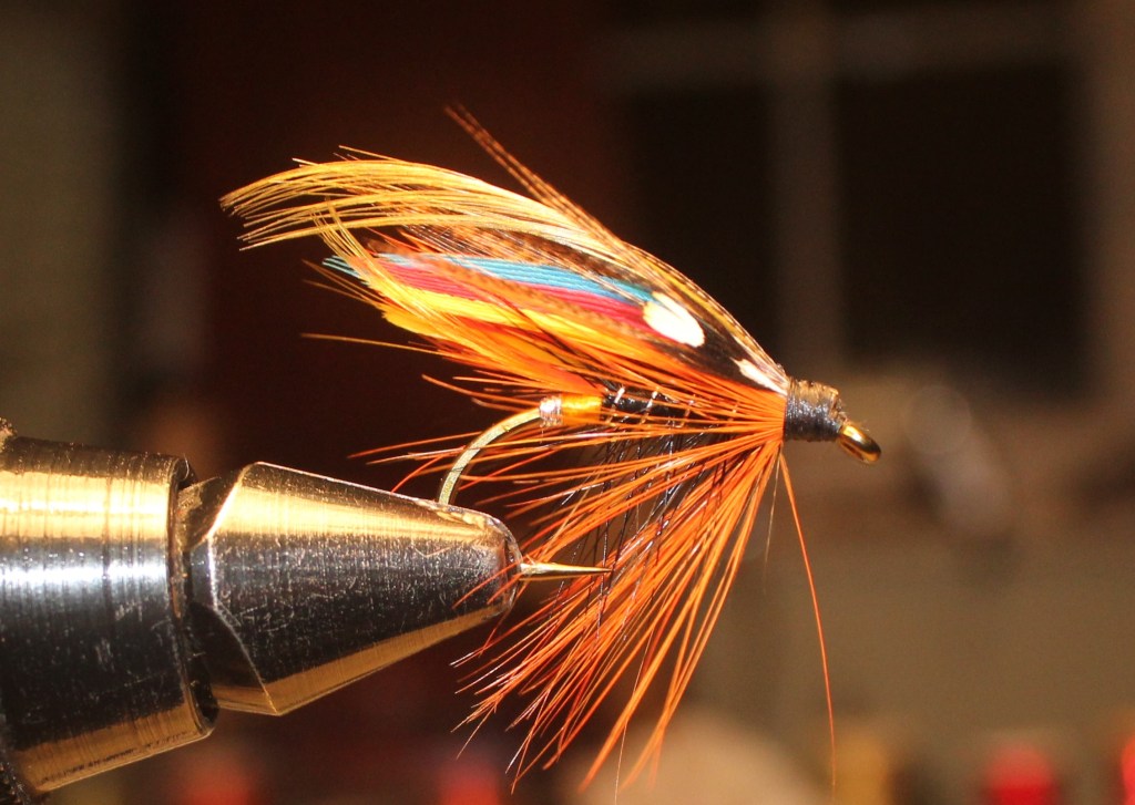 For a hook I use a single salmon iron in sizes 4 down to 10. Tying silk is black. Start the silk at the eye and run it down to the bend where a tip of oval silver tinsel and a couple of turns of golden yellow floss silk are tied in. The tail is a Golden Pheasant topping feather with a slip of red (or Indian Crow if you have some) on top. Now you make a butt from ostrich herl or some coarse wool. I tend to leave out the butt and the fish don’t seem to mind. The body is black floss ribbed with silver tinsel and I add a body hackle of black cock palmered the full length of the floss. The throat hackle is a nice bright orange cock hackle. I use one long in fibre to provide movement. the wings on this type of fly are static so I rely on the hackles to give some life.