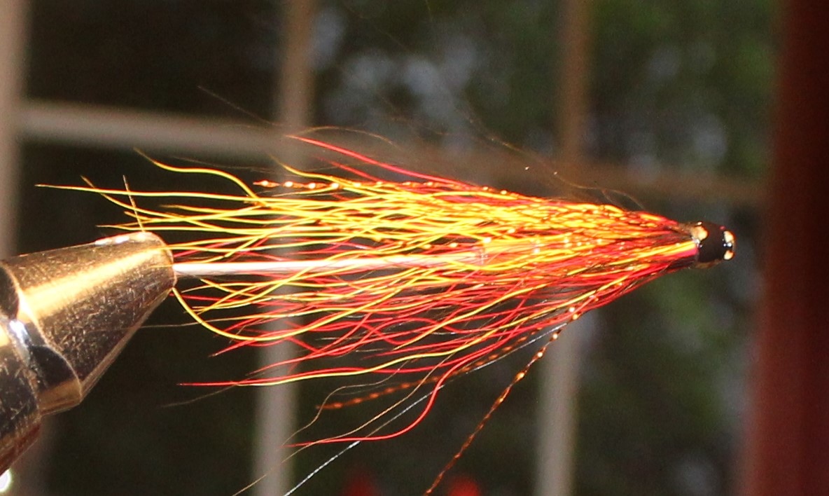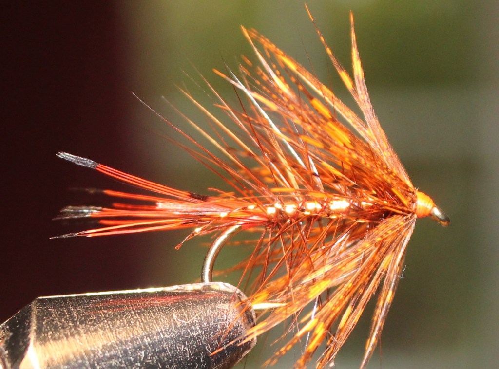 4. The Copper Ally’s is an old pattern now, a simple variation on the ever-popular shrimp pattern. I tie it with a tail made of orange, yellow and red bucktail plus a few strands of copper flash. The body is copper tinsel with a red wire rib and the wing is short brown squirrel hair. Some copper flash can be added to the wing if so desired. The hackle is hot orange, either cock or hen depending on what your personal taste is. Tied very small this can be a good fly for the grilse especially if there is a wee touch of colour in the river.