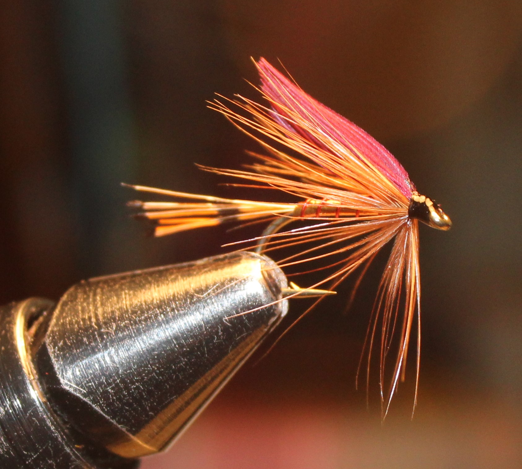 - Cinnamon and copper – I first tied this fly when I lived in Aberdeen and it caught a few sea trout on the Ythan. At the time the Cinnamon and Gold was probably the most popular fly in the area so it was not a huge effort to make a small change and tie the same fly with a copper tinsel body. I can remember that copper tinsel was very hard to come by back them and when I did find some it was very thin lurex. This material was incredibly fragile and the copper body did not last very long in use. GP tippet tails, copper tinsel body ribbed with fine copper wire, light red game hackle and cinnamon hen quills for the wings. These days I tie this pattern on size 12 hooks and make the body from copper Mylar which is much tougher. I also tie a variation with the wings made from matching slips of swan dyed claret.