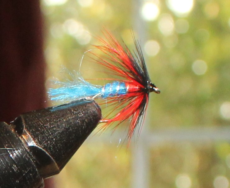 Wind the red hackle, say about three turns. Tie and then wind the black hackle in front of the red one, again about three turns. Tie in and tidy up the head before whip finishing and varnishing the head. There you are, all done! I like this fly tied on smaller sizes for fishing hill loughs, a 14 can be deadly some days. The mystery is what the fish take it for. I know of nothing that lives in lakes which is blue and red!