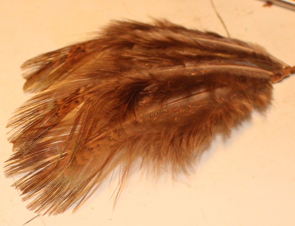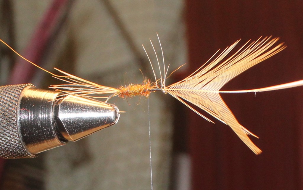 I use black or brown tying silk for this fly and dress it on a size 10 long shank hook. Start the silk and catch in cock pheasant rump feather. Now run the silk down to the bend catching in some fibres of the same feather to make a tail and a length of fine gold wire.