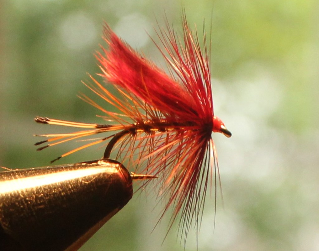 - Claret Wickhams. One of my own patterns (I always sneak a few in!). Dress a normal Wickhams but make the wings from mottled secondary feathers dyed red. Any mottled feather will do, hen pheasant is fine for example. Then wind a claret hackle in front of the wings. A really good fly this one. The one below is sporting GP tippets for a tail but I seriously doubt this makes a whole pile of a difference to the fish.