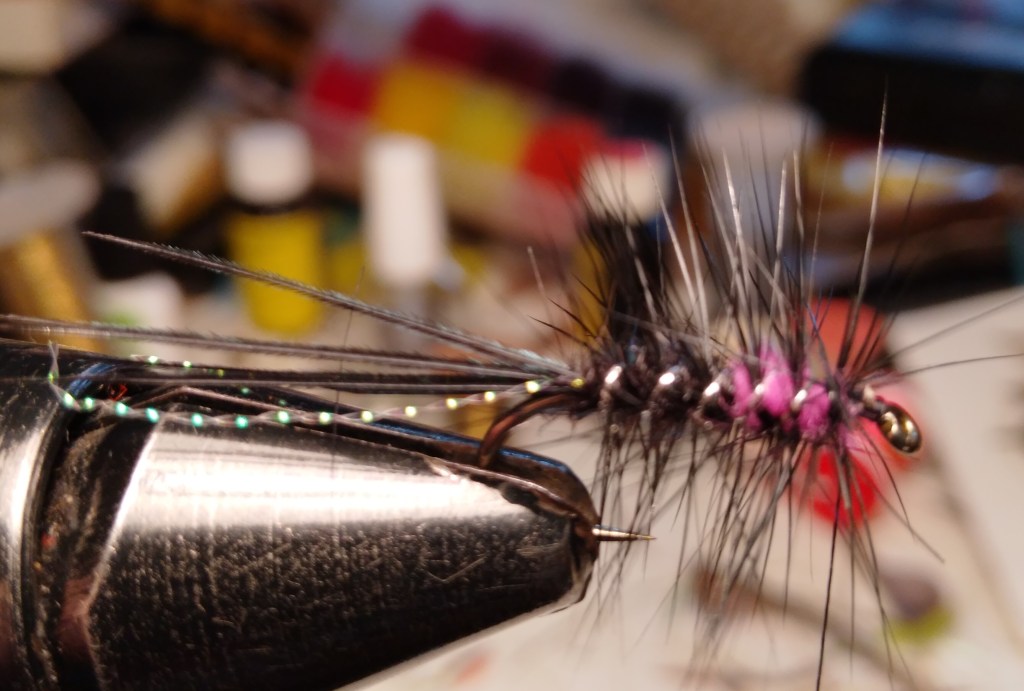To make this fly 8/0 black tying silk is started at the eye of a size 10 heavy wet fly hook. Leave a bit of space at the head before tying in a short fibred black cock hackle and running the tying silk down to the bend. Catch in a tail made from some pheasant tail fibres dyed black, flanked with some pearl flash and a length of oval silver tinsel. Dub some black seals fur on to the silk and make a body to cover two thirds of the hook. Now tie in and wind a piece of fl. pink wool. You can chop and dub it if you prefer. Remove the waste and wind the cock hackle down to the bend in open turns. Bind the hackle in place with the oval silver tinsel, tie in and cut off the tag end. A cloak of bronze mallard finishes off the fly.
