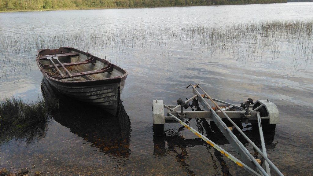 The boreen which had been levelled last spring was a mess of pot holes again and the lough had flooded it during the winter. A line of dead rushes and twigs showed how far the water had reached but now it was down a good foot on the high water mark. The bad dip in the track near where I launch was now a lethal hole filled with rank water so I did not chance driving through it. The launching itself went smoothly and I rowed the boat into my usual spot where I tied her up. Tyres forced under each side of her stern and a couple of extra lengths of twine to hold her straight until the level drops were all that remained to do. Then it was off with the boots and into the car for the quiet and reflective drive home.