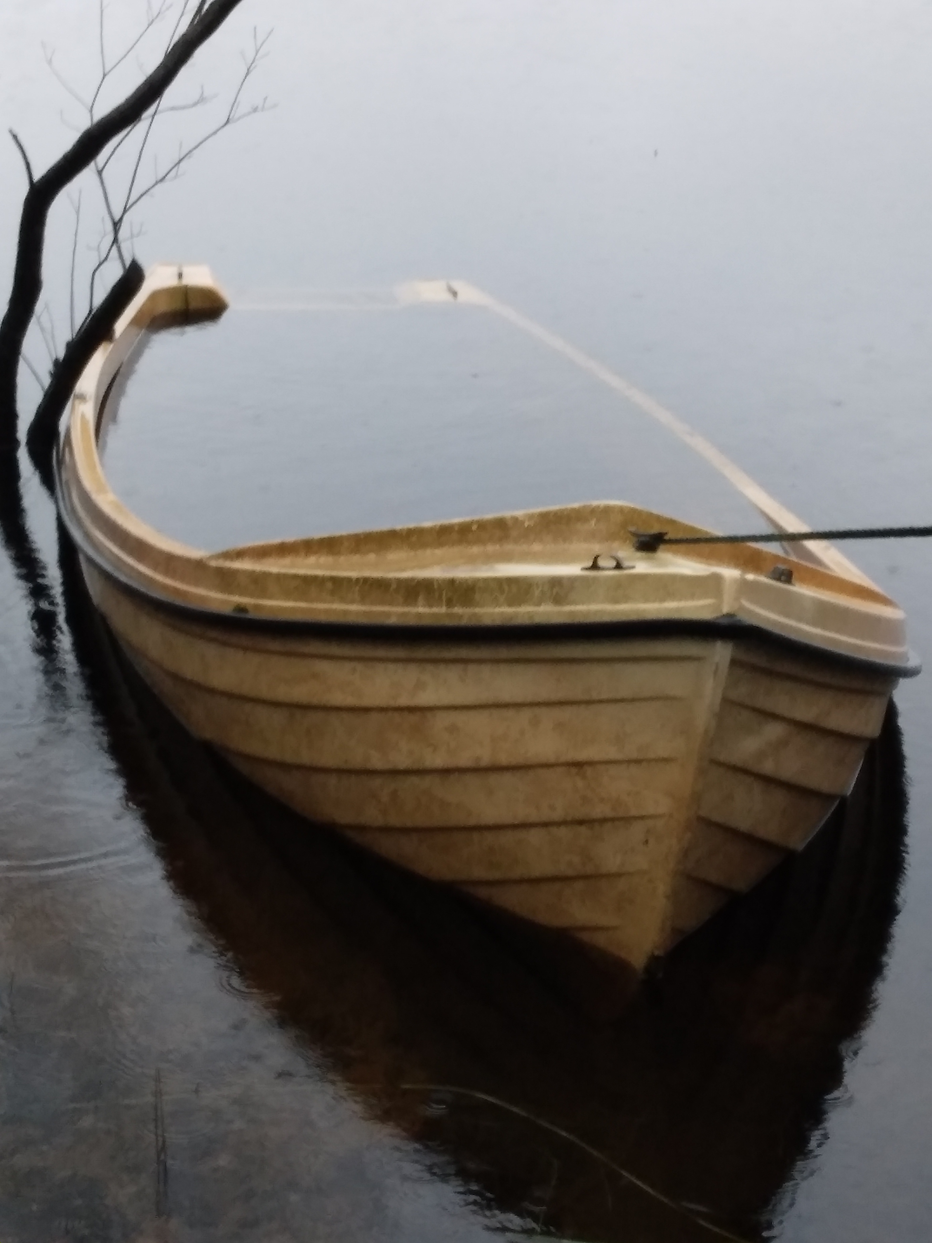 The boreen which had been levelled last spring was a mess of pot holes again and the lough had flooded it during the winter. A line of dead rushes and twigs showed how far the water had reached but now it was down a good foot on the high water mark. The bad dip in the track near where I launch was now a lethal hole filled with rank water so I did not chance driving through it. The launching itself went smoothly and I rowed the boat into my usual spot where I tied her up. Tyres forced under each side of her stern and a couple of extra lengths of twine to hold her straight until the level drops were all that remained to do. Then it was off with the boots and into the car for the quiet and reflective drive home.