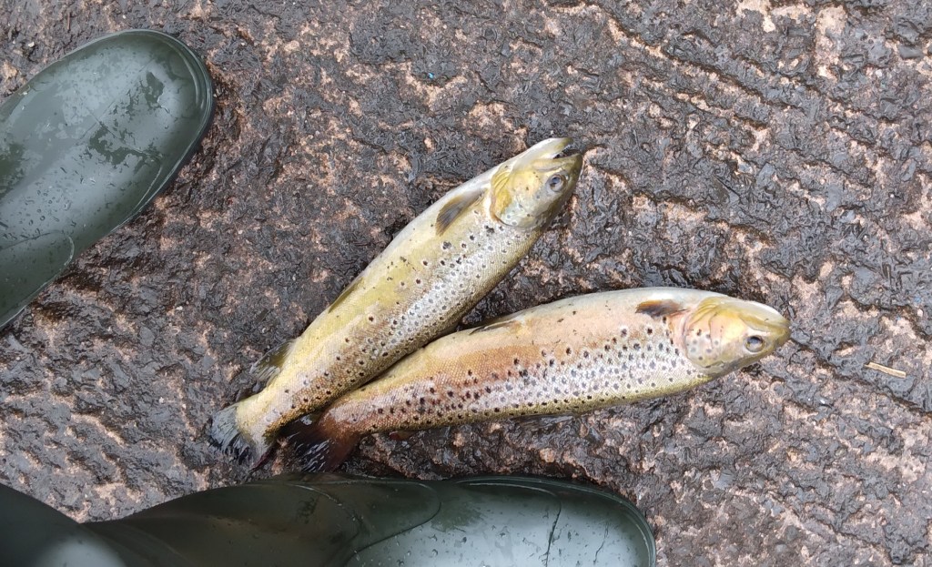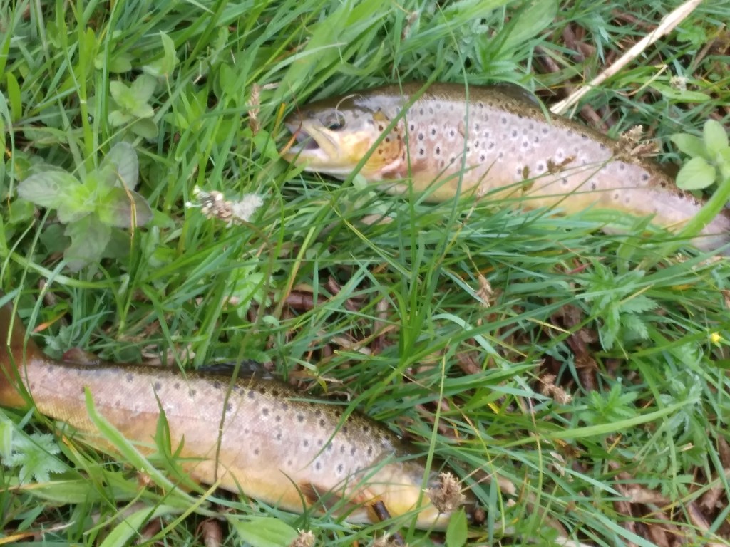 I fished on as the two lads in the cars greeted the truck driver and they planned the stocking. With regimental order the truck was positioned, a pipe fitted to the tanks and suddenly hundreds of trout were being sucked into the lough not 30 yards from me. Some banter from the lads then the truck was off again but by now the water in front of me was heaving with the new arrivals. My line tightened and I struck into a trout but it came off almost immediately. Before I had time to retrieve the slack and re-cast another fish had grabbed the tail fly and was safely landed. Quickly released, I cast out and this time two trout were hooked! Both fell off but a few chucks later I had another brownie. And so it went on, cast, fish, release, cast, fish, release, etc. Double hook ups were common, trebles happened three or four times. Casting to fish which showed almost always resulted in a hook up but fishing blind pulled them too. I photographed some but my mobile was getting all slimy so I stopped after a dozen or so.