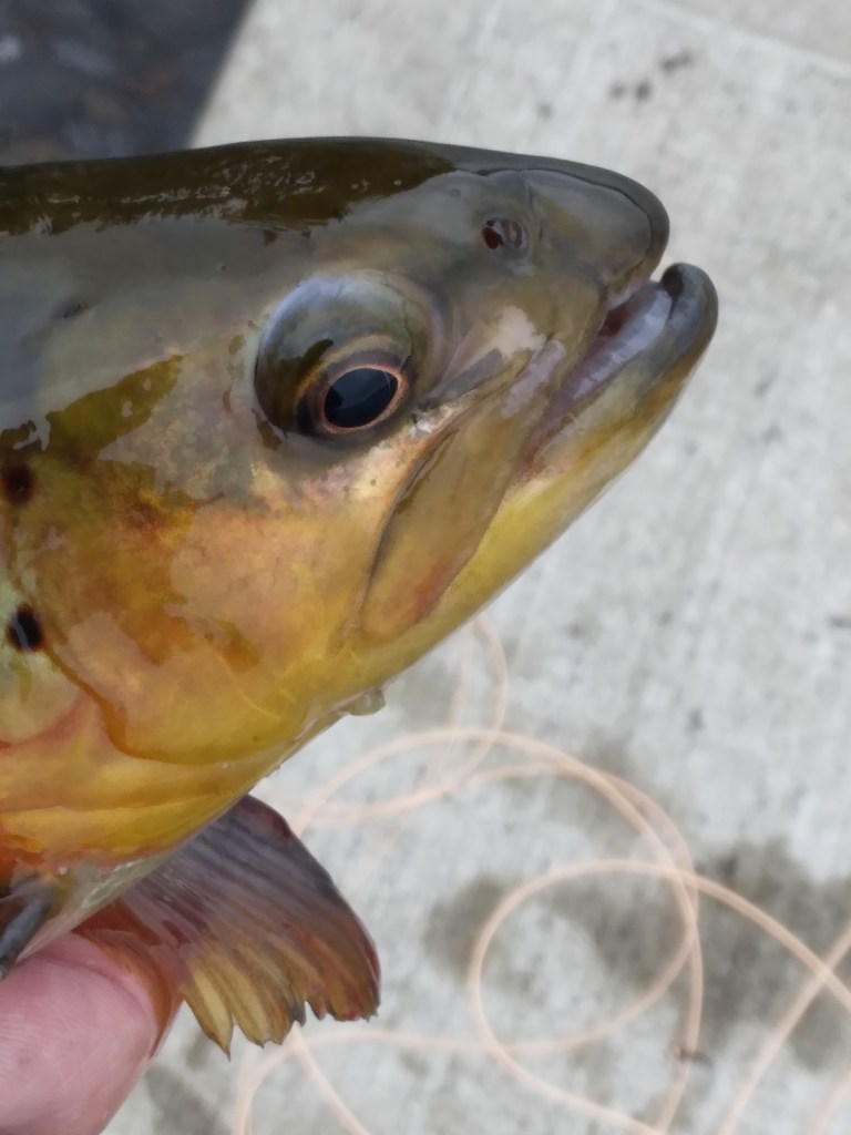 Fish were all around me so I kept casting and catching. I thought about stopping when I had landed 20, but that came and went and I was still catching. The fish were typical stockies, about 14 ounces in weight and generally in good condition apart from some chewed tail fins and stunted pectorals. I swapped flies just to see if that would make any difference but to be honest I could have thrown in bare hooks and probably caught just as many! A black goldhead was probably the most effect fly but a peach muddler caught a few as well.