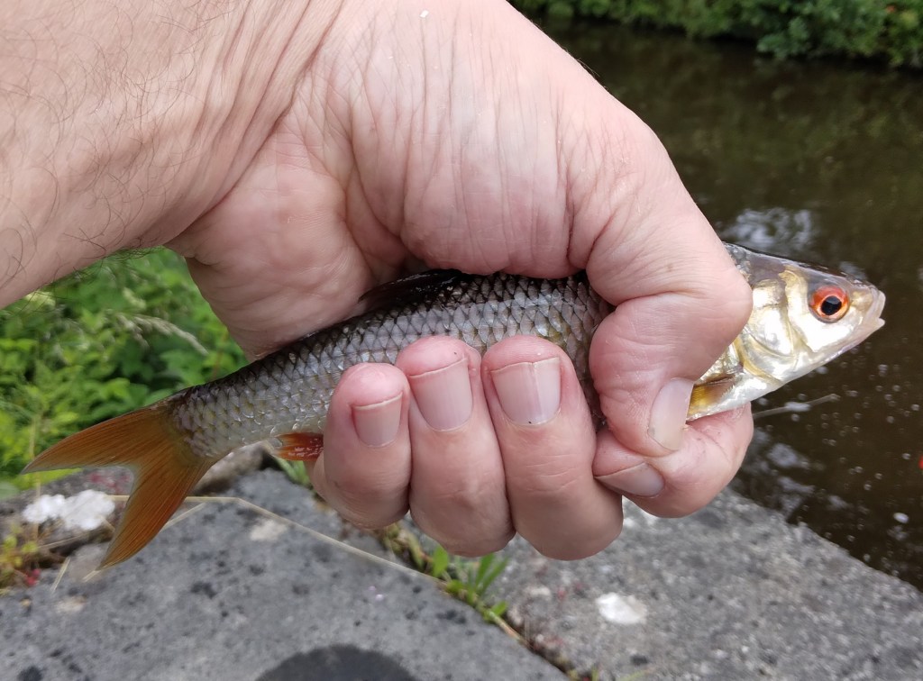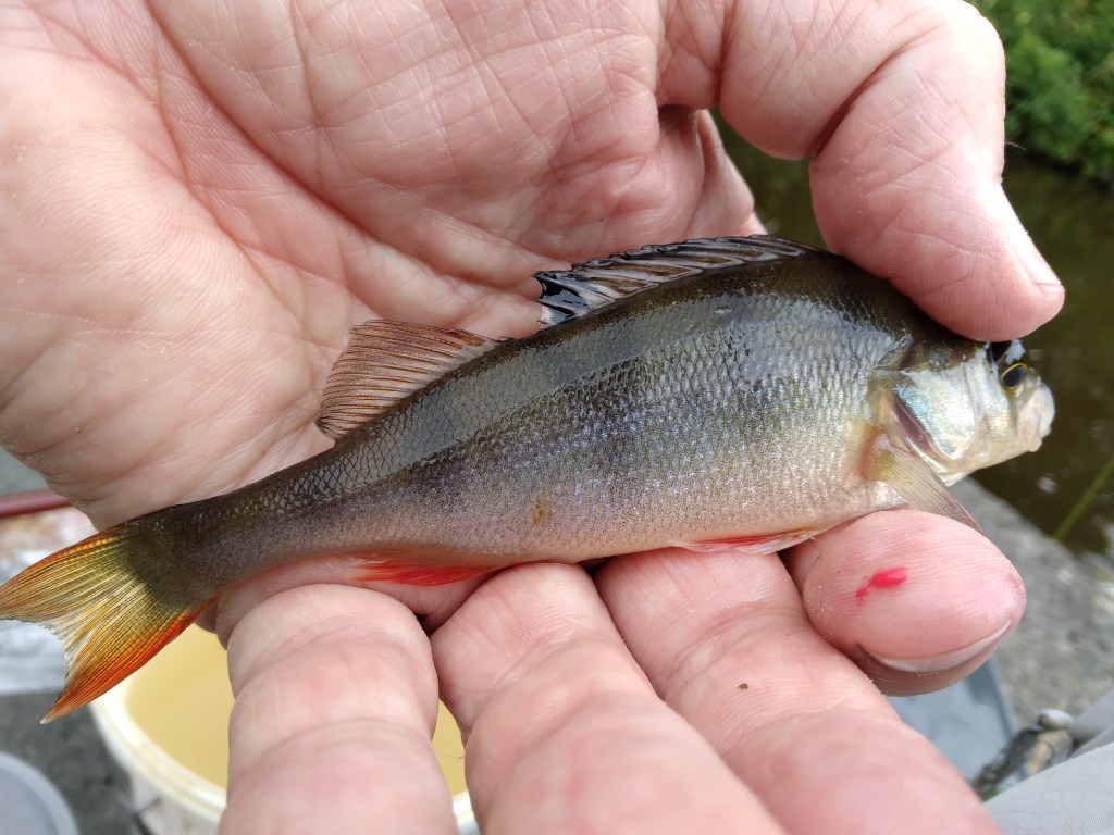 The leger rod gives a nod and I wind in a tiny perch. Next the float disappears slowly and another small perch wriggles on the end. I have to wrestle a small branch out on the float rod after my hook catches on it in the murky water. I loose feed a few maggots and am soon rewarded with the first of a string of roach. None of them are any great size but I do love catching these pretty fish.