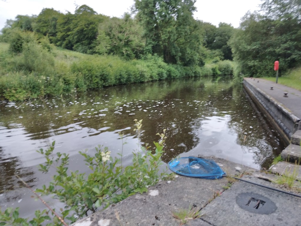 A car park beside the locks was a huge benefit for me and I parked up and unloaded all the gear. It’s mid-summer now and the air is warm. We have had some rain recently so the salmon and sea trout are running but I want to avoid the crowds and just do some gentle canal fishing instead. I find the lock and park up. Only a few people around and a boat is passing through the lock as I tackle up. Immediately below the lock there is a flat concrete structure where I can fish from with ease. The canal is very dirty due to recent rain.