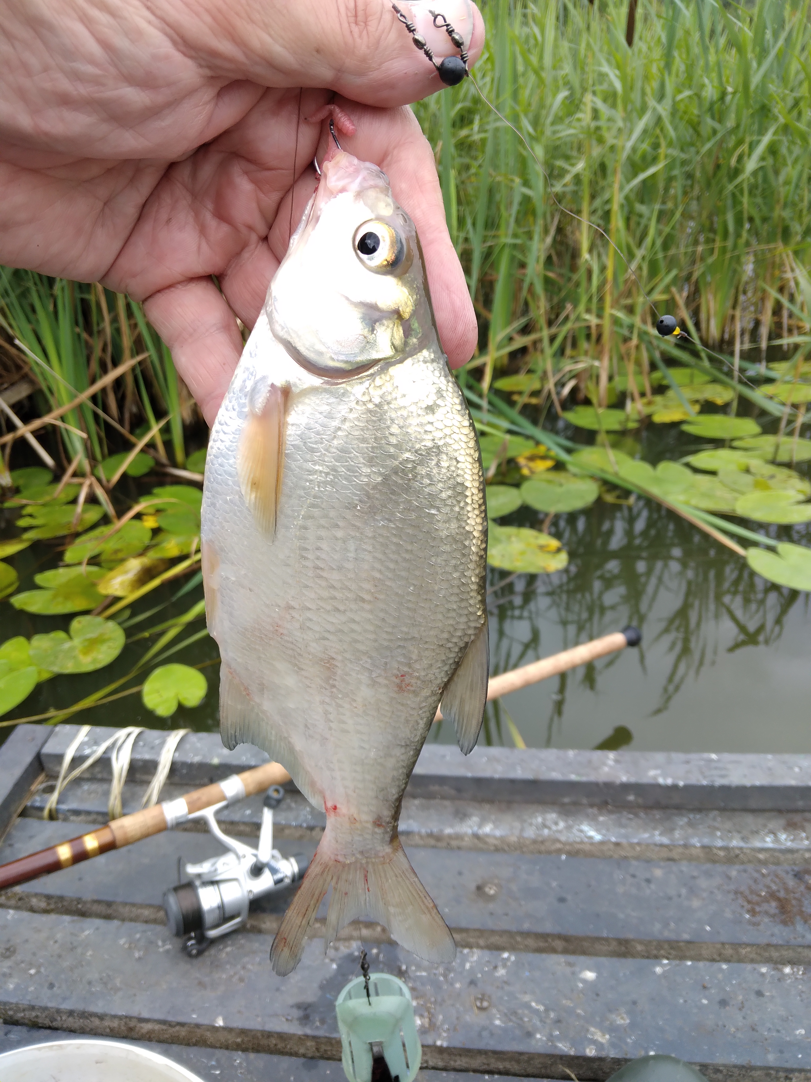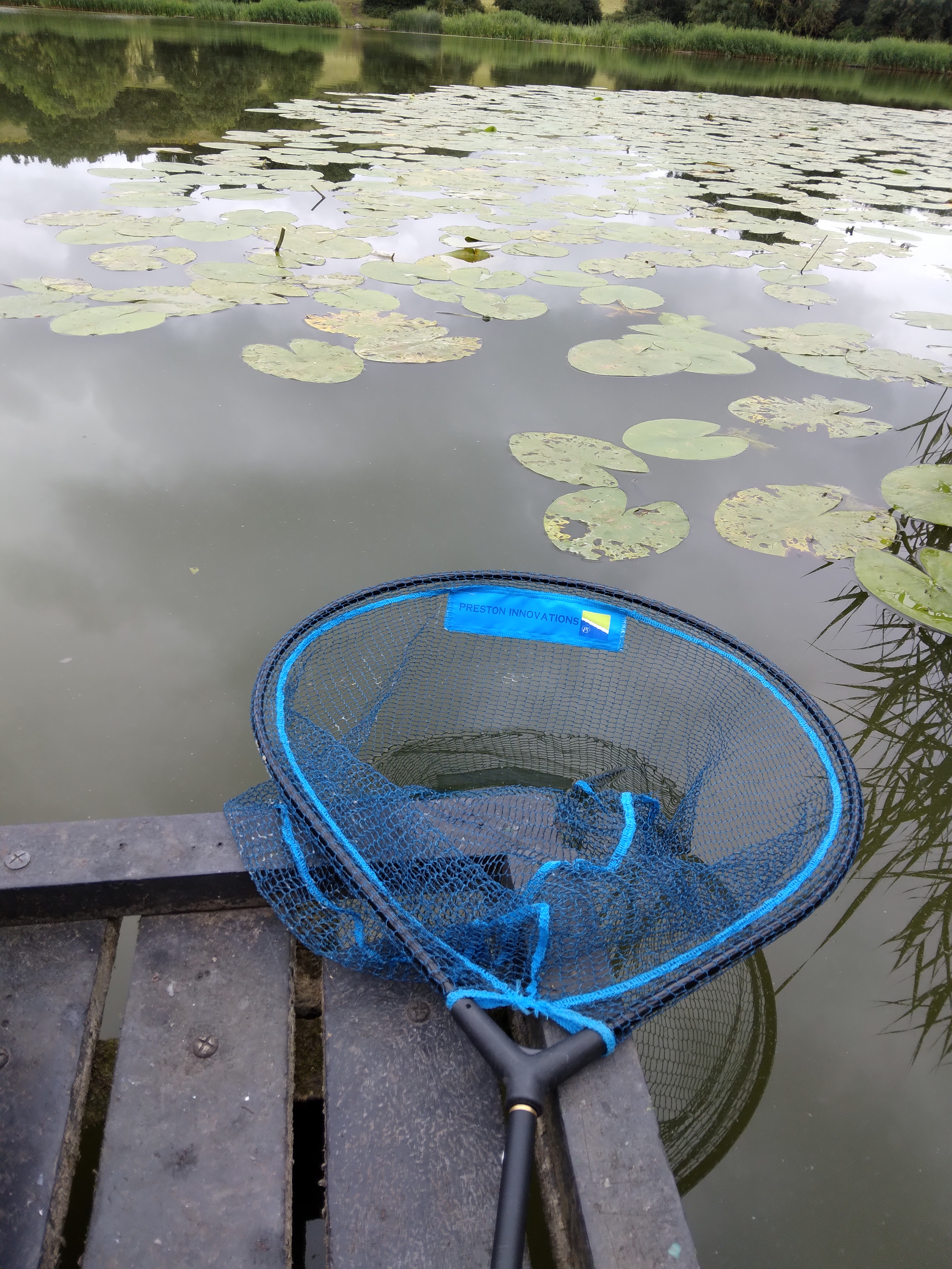 I decide to leave the heavy leger rod in the car and instead bring the 13 foot float rod and the 12 foot swimfeeder. I tie on a helicopter rig and a maggot feeder on the 12 footer and bait up with a bunch of maggots on a size 10 hook. Groundbait is mixed and balls tossed in and then I cast out, just a couple of rod lengths out, hard up against the lily pads. I turn my attention to setting up the float rod but this takes me ages as the swimfeeder get bites right from the off. I miss the first couple before setting the hook in the third one. A small skimmer comes to hand, is snapped and quickly popped back into the green water.