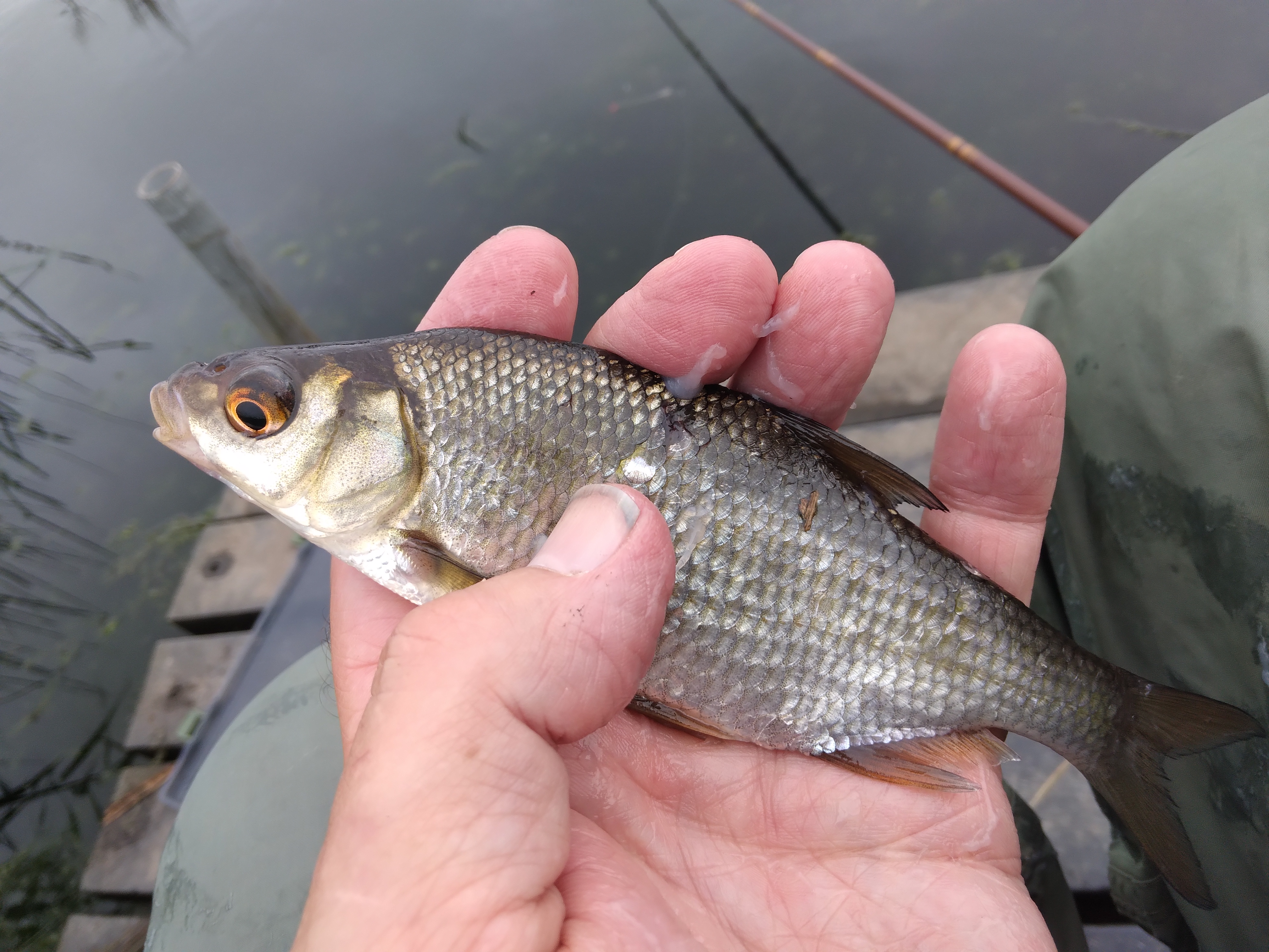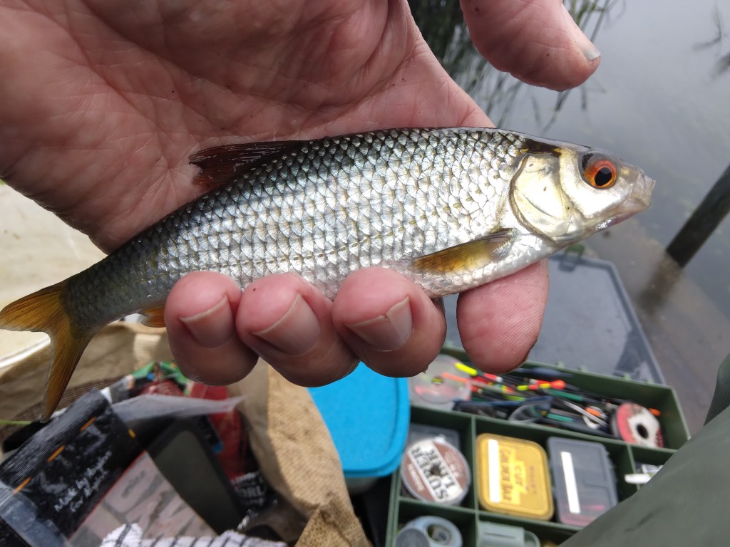 Balls of groundbait were lobbed in and I settled down, water running off my oilskins. It took about twenty minutes for the first bite to come but after that it was pretty steady for the rest of the session. Apart from one good rattle (which I missed), the swimfeeder remained stubbornly quiet but the float rod was busy. First, a couple of hybrids took the maggots, not big fish but game little fighters. Next the perch showed up and finally a shoal of roach took up residence in front of me. The wind was a pain and it made accurate casting very hard but I persevered and caught fish on a regular basis. About 1pm the float dipped and I lifted into a bream which was gratefully received. It turned out to be the only one though (so much for bream travelling in big shoals).