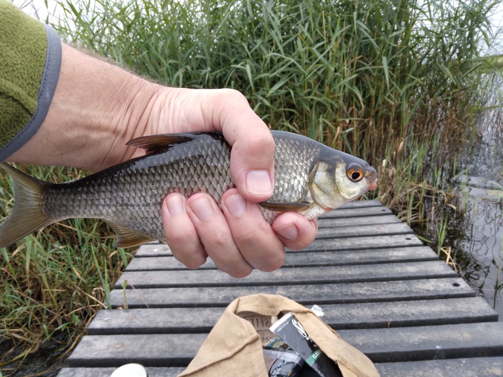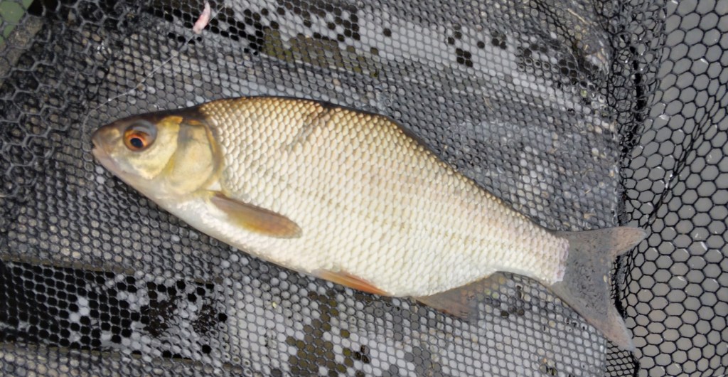Sure enough, the float shoots down and a small hybrid comes to hand on just the third cast. It is only a little lad but it is an encouraging start. Next a small roach comes in. Roach! There was no word of them when I was researching this place. Next up is a skimmer and then another hybrid, this time a good one of around a pound. The wind is blowing from left to right and I am sheltered from it by the high bank of reeds so it is nice and comfortable as I ply my trade of cast and then wind in a fish. It is pretty much a fish a chuck now and some lovely hybrids are putting up a hell of a scrap when they feel the hook. A bonus bream or two show up and then some small perch. The roach seem to be gathering off to my left and a cast near the lily pads on that side almost always produces a silvery eight incher. Bites are almost all the same, a sharp and sudden disappearance of the float. No messing.