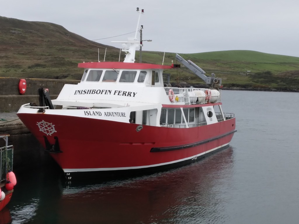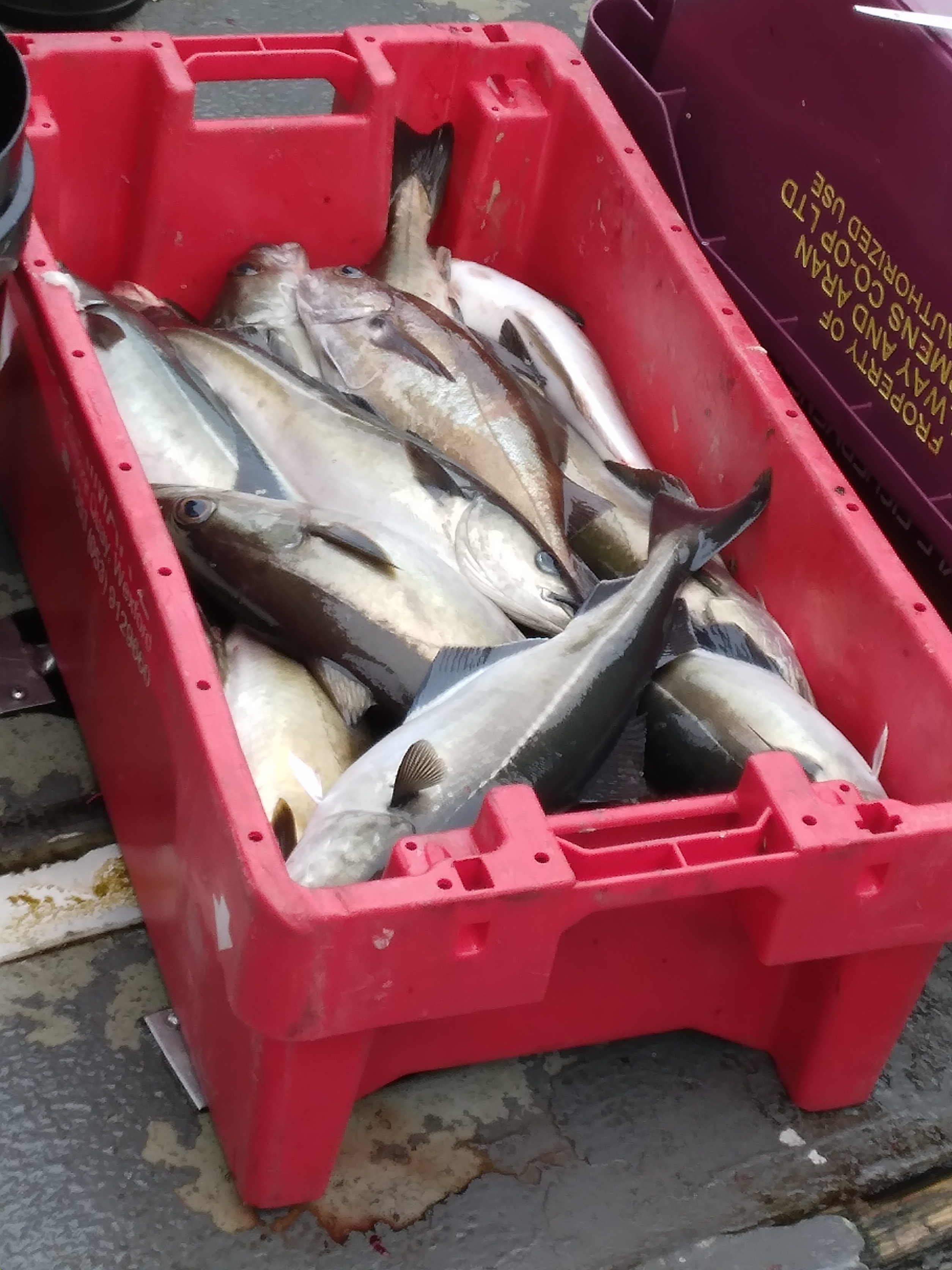 Off again, we started drifting close to the stags of bofin, roughly hewn rocks which rise from the sea off the west of the island. Here we had the best fishing of the day with a constant stream of pollock to six pounds, mackerel, wrasse and coalies. I had a lovely female ballan wrasse of about four pounds, my best one for many years. The coalies were vociferous as usual and since they were around three pounds each and we were hooking them two or three at a time they put a good bend in the rods. All too soon it was time to pack up and head back to shore, the gory ritual and gutting and filleting being carried out on the bucking deck as we drove east around the headland and back to the harbour. We had filled two boxes with quality fish, enough to ensure we all went home with a supply of fillets for the freezer. It is a small harbour and the ferry was tied up against the quay so all our gear and fish had to be manhandled into the ferry and down the gangplank on the other side. Another day over.