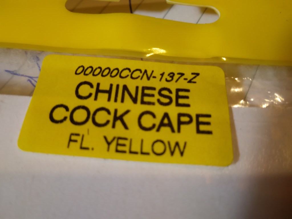 I used either blue or black tying silk for this fly. The tag, tied slightly around the bend of the hook, is 6 turns of size 14 oval silver tinsel. This will replace the normal tag of tinsel and yellow floss and also the butt of black ostrich herl which I don’t thing is required. A tail made of a golden pheasant topping and body of flat silver tinsel are just the same as in the original. The palmered body hackle is either a lemon cock hackle or one dyed fluorescent yellow (I get mine from Veniards) which is held in place with more fine oval silver tinsel.