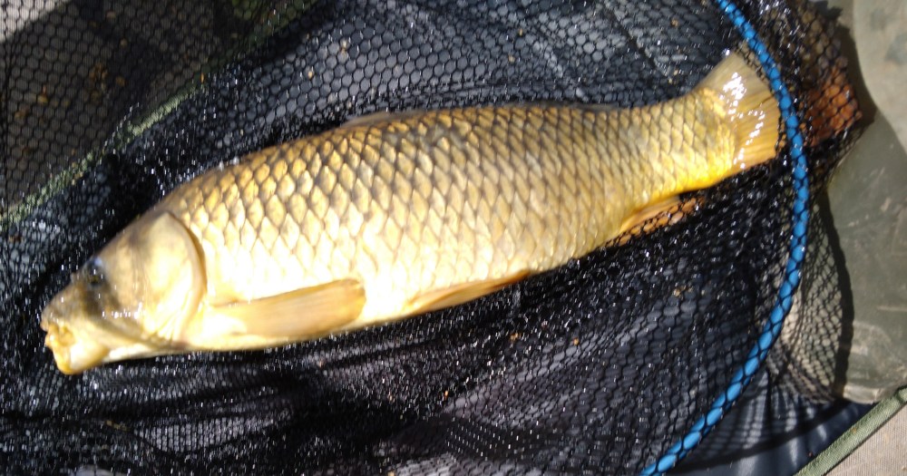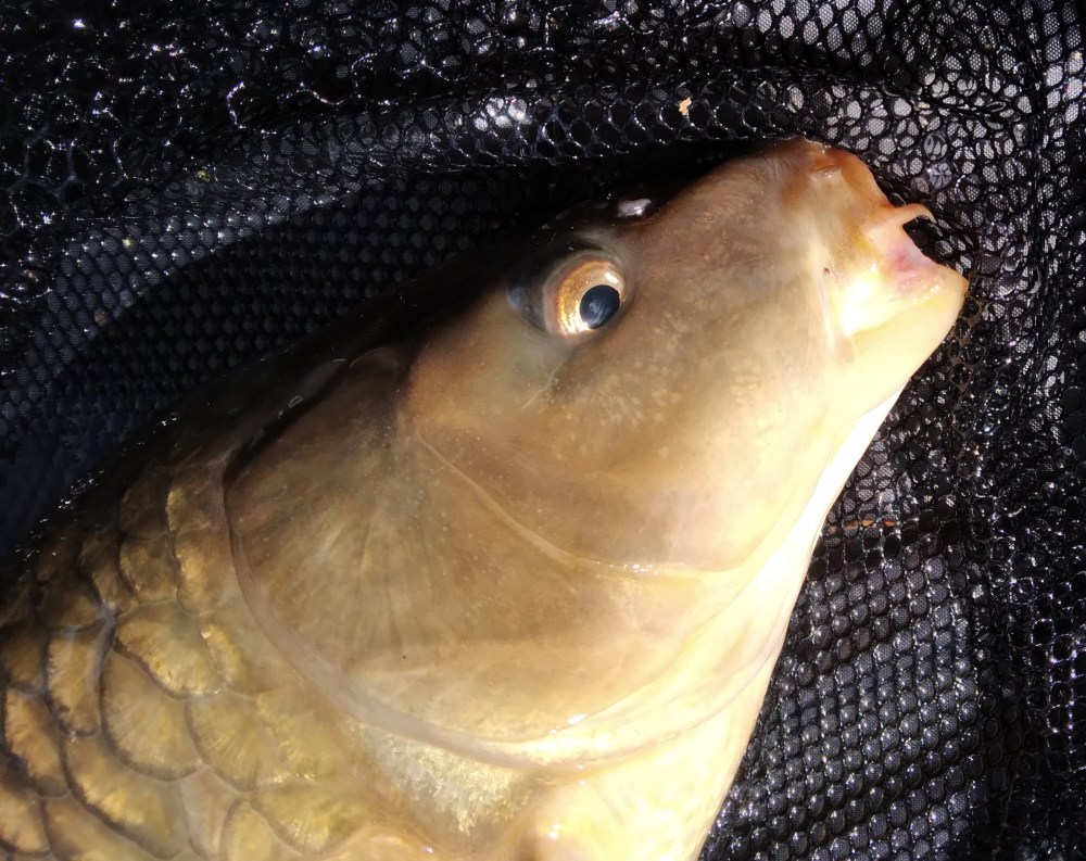 These skimmers were in lovely condition and not nearly as slimy as most snotties are. About an hour in the float dipped and I lifted into a solid fish which ran off to my right and took a bit of battling to get back in front of me. The carp stayed deep and put up a dogged fight but I eventually slid it into the net, a beautiful fish of about six pounds. As near as I can recall this was my first carp since 2008 when I caught some in the UK. It was a bit of a tight fit getting the carp into my meager net so it might be time for me to think about investing in a larger model, it would be handy for my tench fishing too.