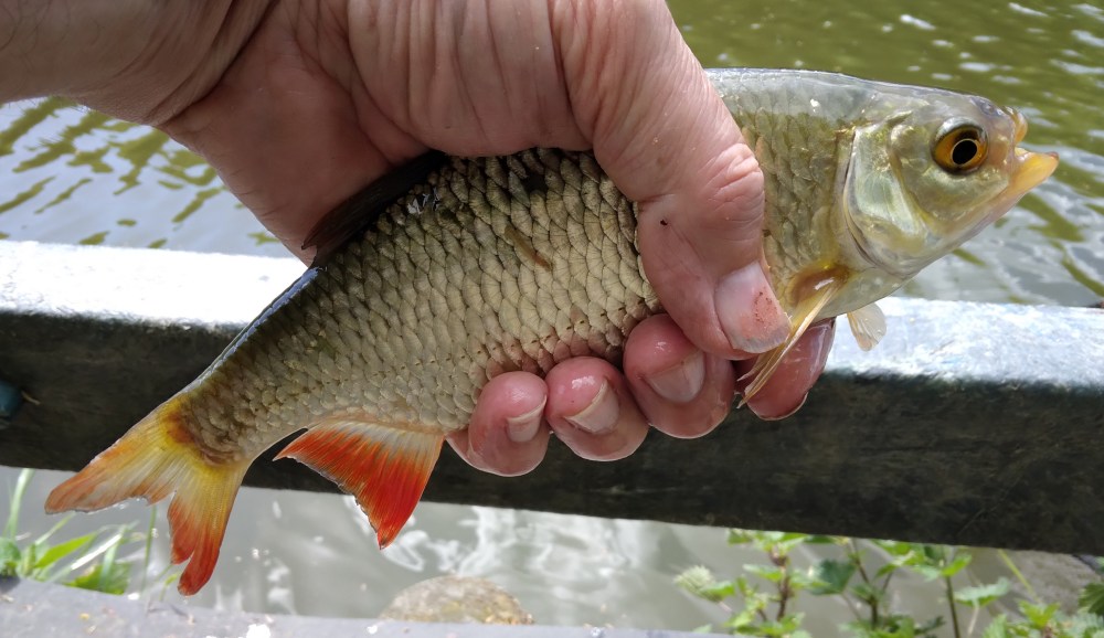 Some tiny rudd and perch kept the count ticking over then a shoal of roach camped in the swim, sitting in mid water so the bites were mainly seen as the float lying flat instead of cocking. A second carp, maybe a pound lighter than the first one came along and fought hard under the beaming sun. The cat, which had been sunning itself next to me, pounced on a small roach which came off the hook as I swung it in, a trick I am sure it has performed many times. All the time I was trickling in maggots and small balls of groundbait.