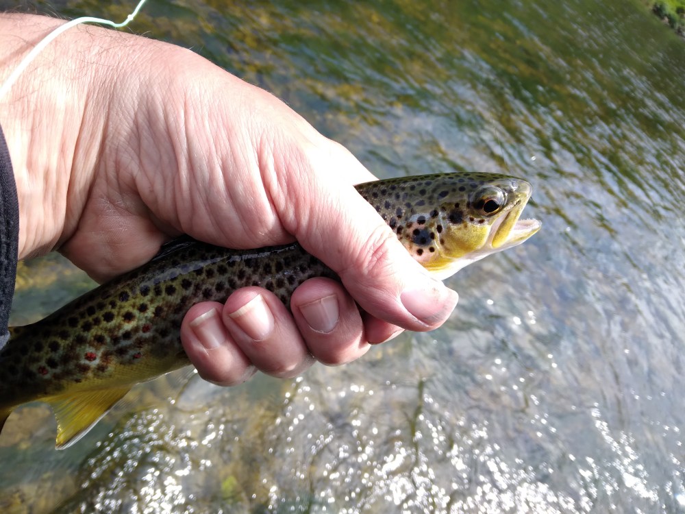 It felt like the years had rolled back and I was fishing the way I used to. Casting to rising fish is an intoxicating pastime and I became utterly absorbed in spotting a rise, making the cast and hooking the fish. Gradually I worked my way down the run, willows behind me forcing me to be inventive with my casting. Trout seemed to move around and were not holding station, meaning throwing the flies to the exact spot where I had seen a rise rarely produced a take. More were lost than landed but by the time the short lived rise had petered out eight gloriously spotted browns had fallen for my flies. None were better than 12 ounces I suppose but that didn’t matter a jot to me. In the end it was honours even with roughly the same number of fish on the wee black spider and the PT.