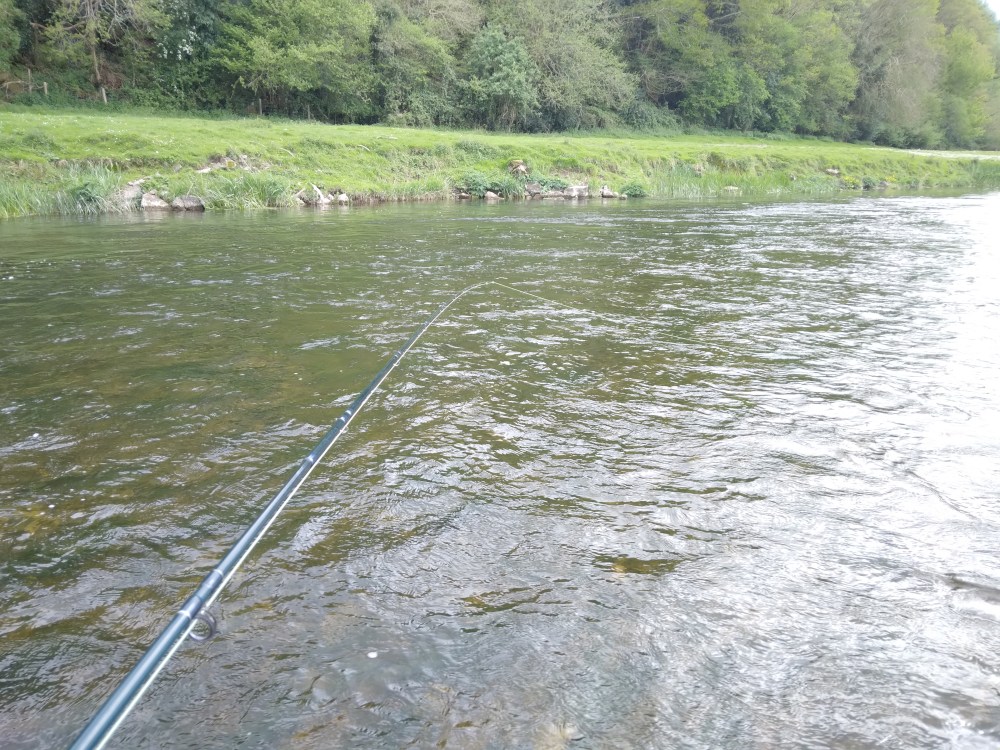 The Nore here is a wide river which reminded me of the Aberdeenshire Don where I learned to fish all those years ago. Low, clear water and a strong upstream wind under bright sunshine were far from ideal conditions but I togged up and walked down the bank, looking for signs of life. It quickly became apparent the river was stuffed full of fish, I could see them in the crystal water holding near the bottom. Fishing down a long slow run failed to meet with any success so I swapped my nymphs for a pair of spiders and fished down a fast run but again, without so much as a pull. The river felt lifeless with no signs of fly life and I was beginning to think this had been a step too far for me. I had arrived too late for any lunchtime activity and too early for the evening rise. Changing flies again I put a black spider on the dropper and a PT nymph on the tail before moving a bit further down the river.