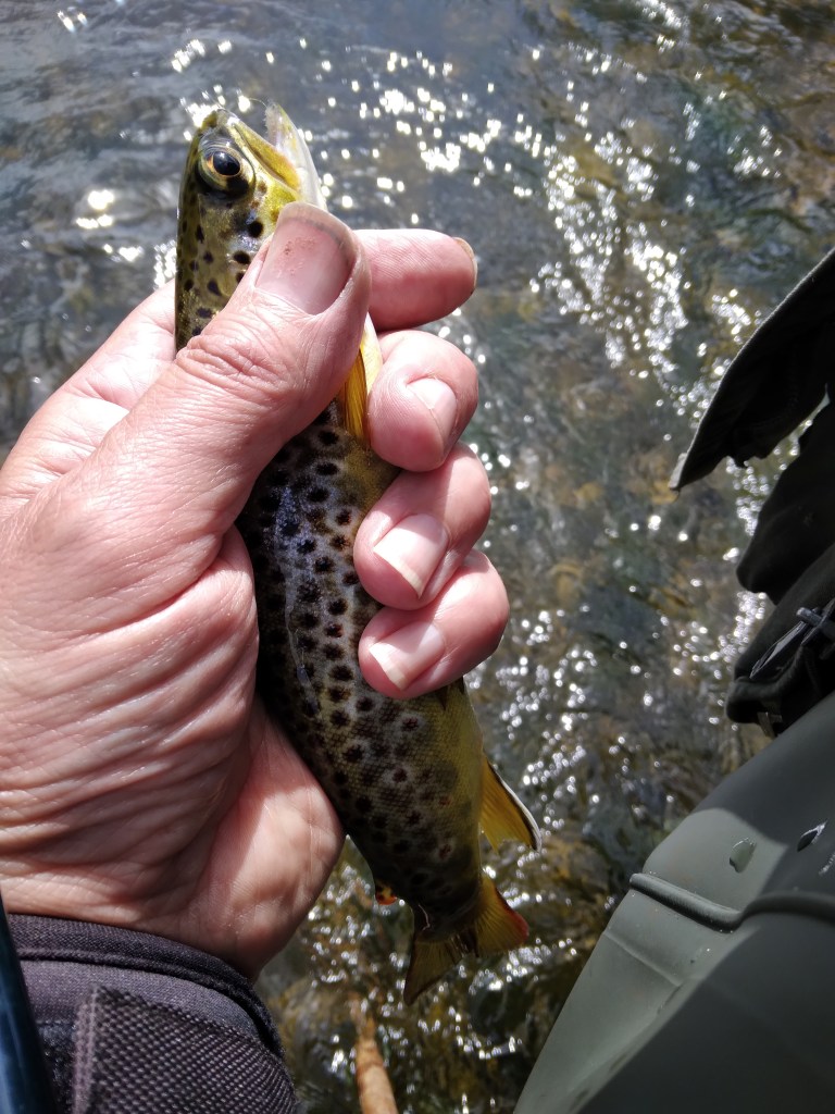 There! Under the far bank in a back eddy I saw a rise. Too far to cast to but perhaps the beginning of some action, it was hugely encouraging to at least see a fish on the surface. Minutes passed then another fish rose nearly directly below me, quickly followed by another within casting distance. Knots and hooks checked, I started to cast, concentration levels at their highest. Cast and mend, cast and mend. A pluck but no contact. More fish rising now and I can see a very small dun on the water. Finally a solid pull and a small trout comes to hand! I breath a sigh of relief, over an hour had passed before I eventually landed this small fish but it felt like a triumph in these conditions.