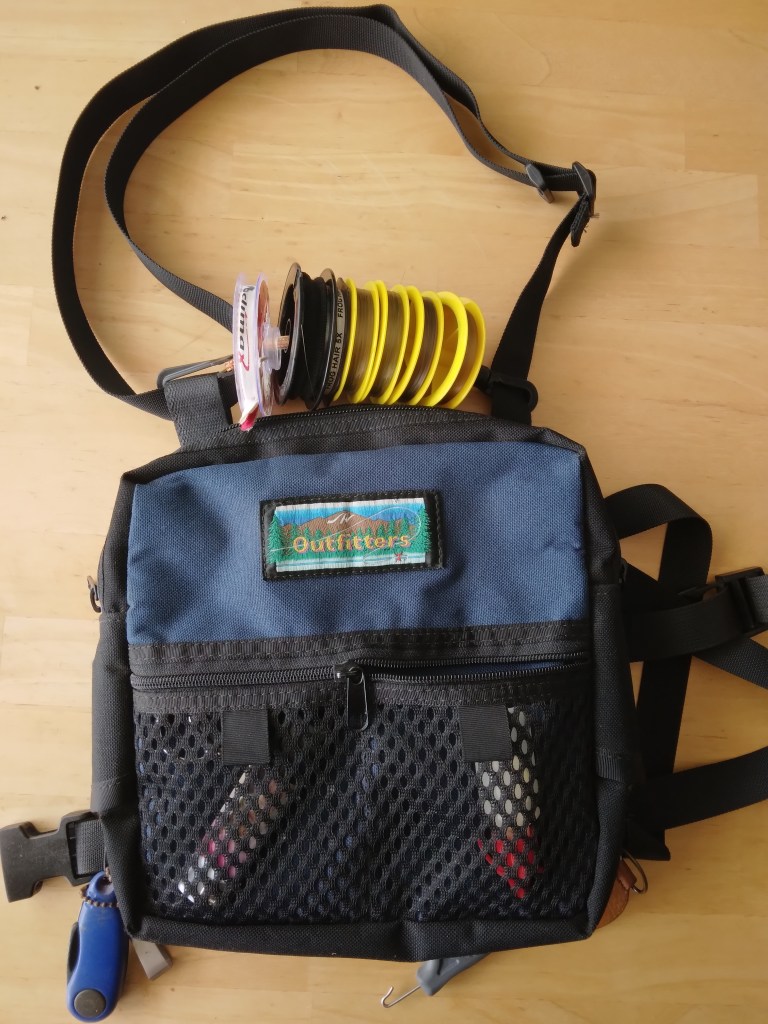 When I am fishing on the lough the main tasks I face are changing flies, sorting out tangles or repairing/replacing leaders. Changing the flies currently means reaching into my big bag and pulling out a fly box. Sorting out tangles requires the use of nippers or a needle. Working on leaders means reaching into the pocket on my bag where the spools of line and cast wallets live. My idea was to have the basic tools to carry out all of these functions in the chest pack, saving the time and hassle of rummaging about in the main bag. This does not sound like a major upgrade but my bag can often be out of reach when others are in the boat with me. So I set to work, gathering together some bits which might, or might not, be of use. First there was the pack itself.