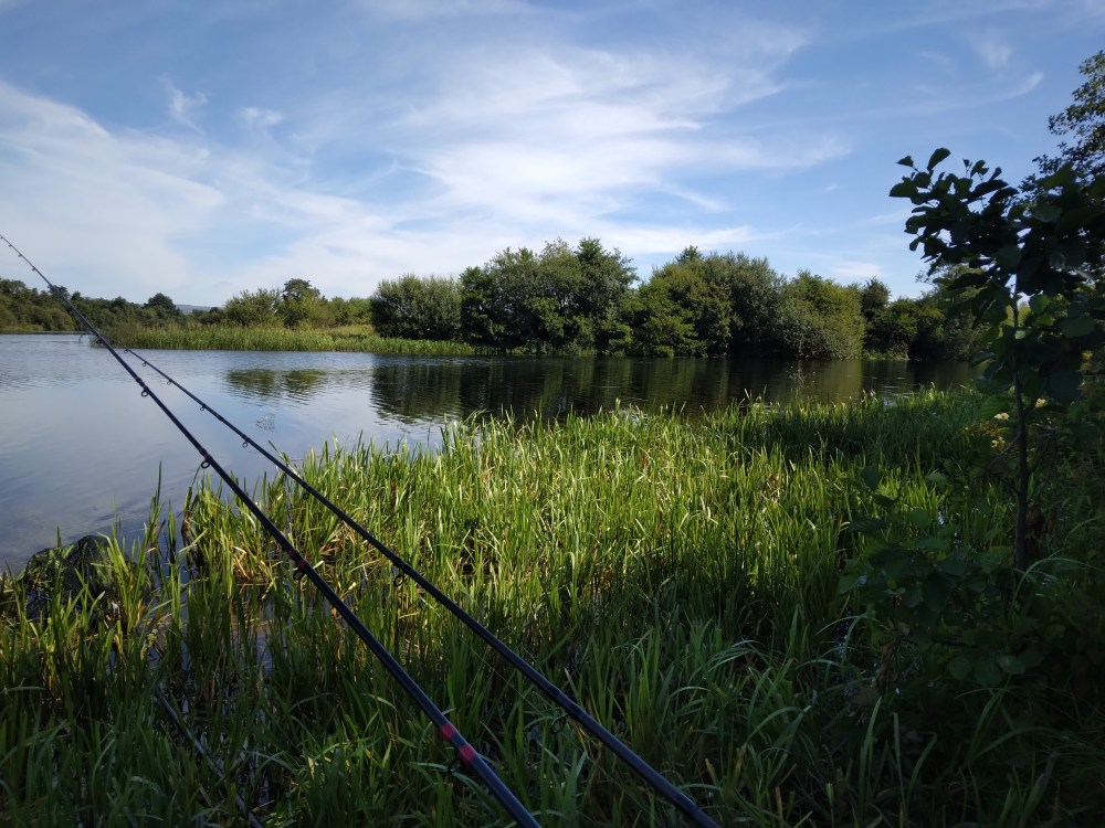 Car parked, I lugged my heavy load of gear along a faint path in the oppressive heat. I had more weights and groundbait than normal as well as an extra rod and the whole lot felt like it weighed a ton. At least I didn’t require my thick waterproof coat for a change. Summer had arrived at last and the hot weather is due to last all week. I trudged across a couple of fields, the second one full of horses. A faint path led me to the boundary wall of an old cemetery and from there I could discern a thinner spot in the reeds beside some trees. The only issue would be getting across a barbed wire fence atop a bit of a drop. It took me a few minutes to crawl under the wires and push through tall nettles and brambles but I made it.