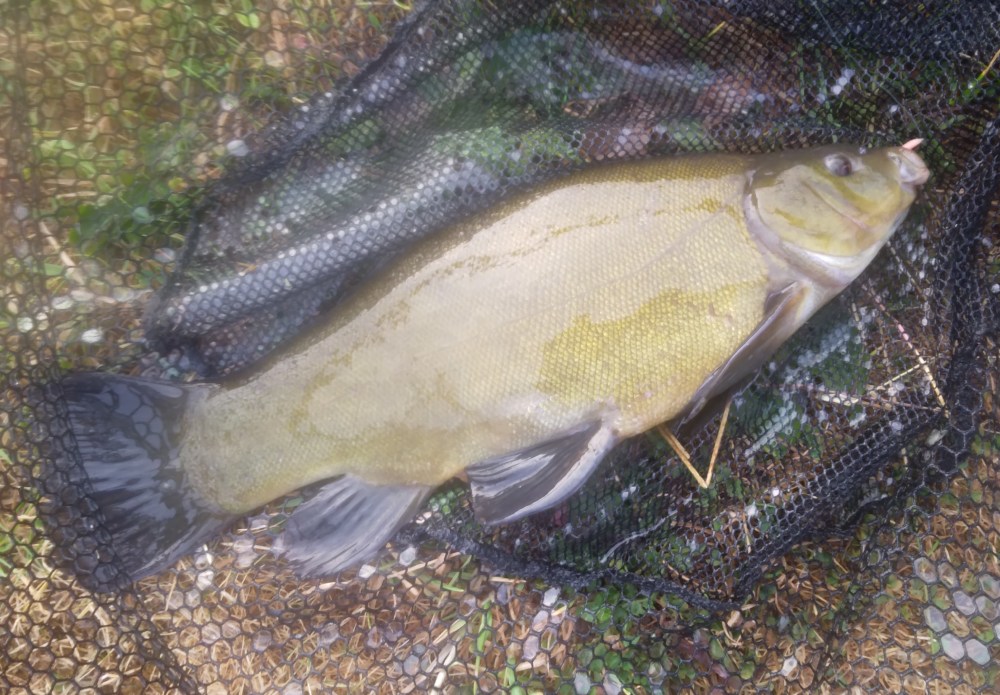 By now I could see some tell-tale bubbles from feeding tench quite close in. The last of my ground bait went in, rolled into small balls to reduce any disturbance when they hit the water. Some small rudd showed their appreciation by gobbling up my maggots but then the float moved off before plunging down. This second tench was a lovely fish which put up a great scrap before sliding into the meshes. In contrast to its predecessor, this one was fin perfect. A perfect example of an Irish tench.