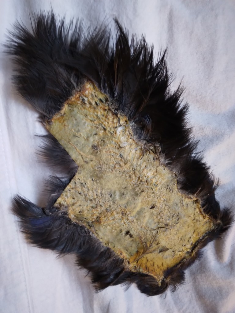 The skin, paper thin and very well preserved, looks like it comes from the neck of a relatively large bird. A previous owner had cut off a two inch square patch from one end and some of the feathers have been used judging by a couple of bare patches in the middle. That said, there are a lot of very useable feathers still on the skin. Structurally, the individual feathers are very similar to golden pheasant body feathers, leading me to wonder if this is indeed from some sort of dark species of pheasant? The individual strands are very fine and mobile, just about perfect for head hackles on Bumble or Octopus patterns.